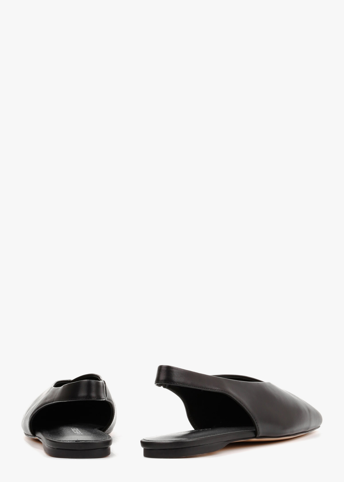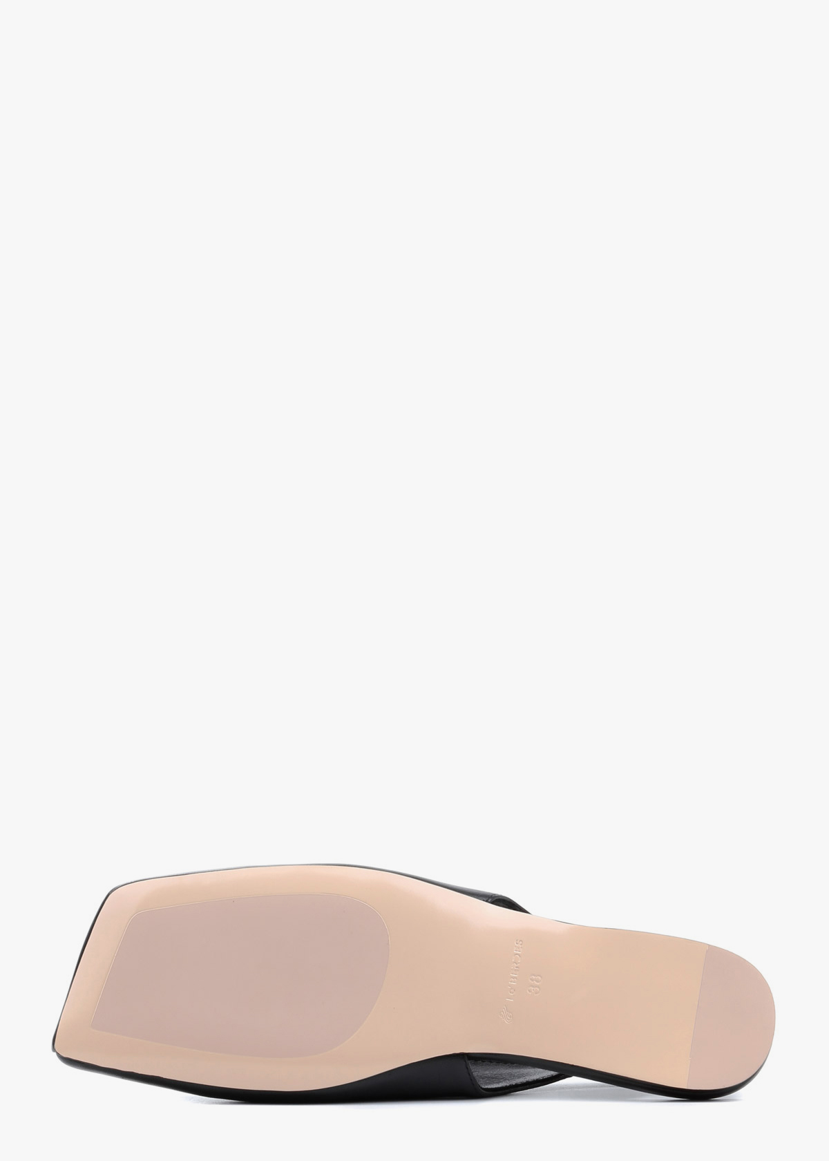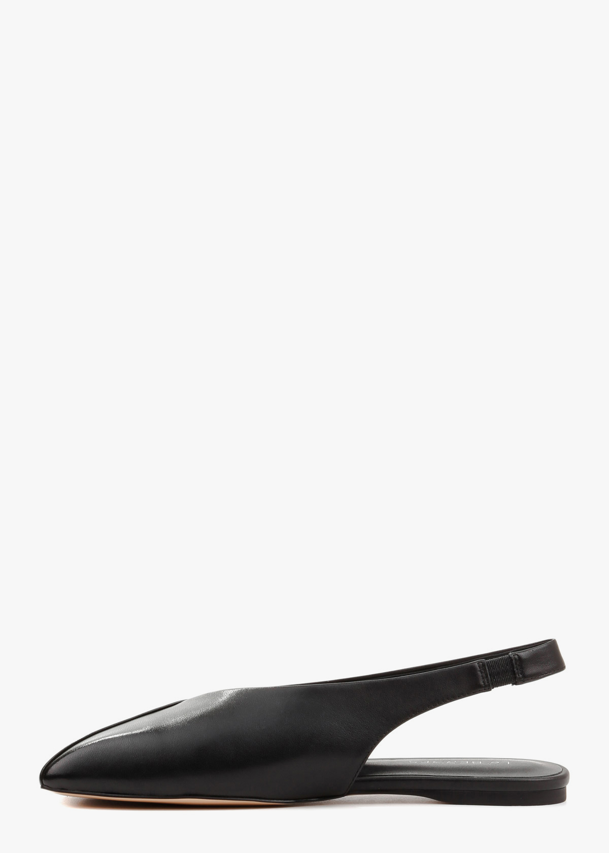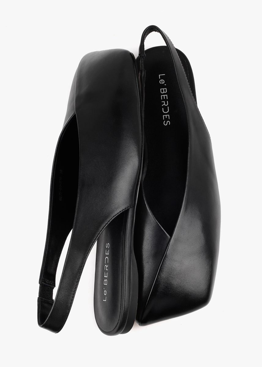 Витончені жіночі сабо з відкритою п'ятою у чорному кольорі, виготовлені з м'якої натуральної шкіри. Модель вирізняється сучасним лаконічним дизайном із закритим квадратним мисом та еластичним ремінцем на заднику для комфортної фіксації. Тонка плоска підошва робить цю пару ідеальним вибором для легких та стильних літніх образів у дусі мінімалізму.