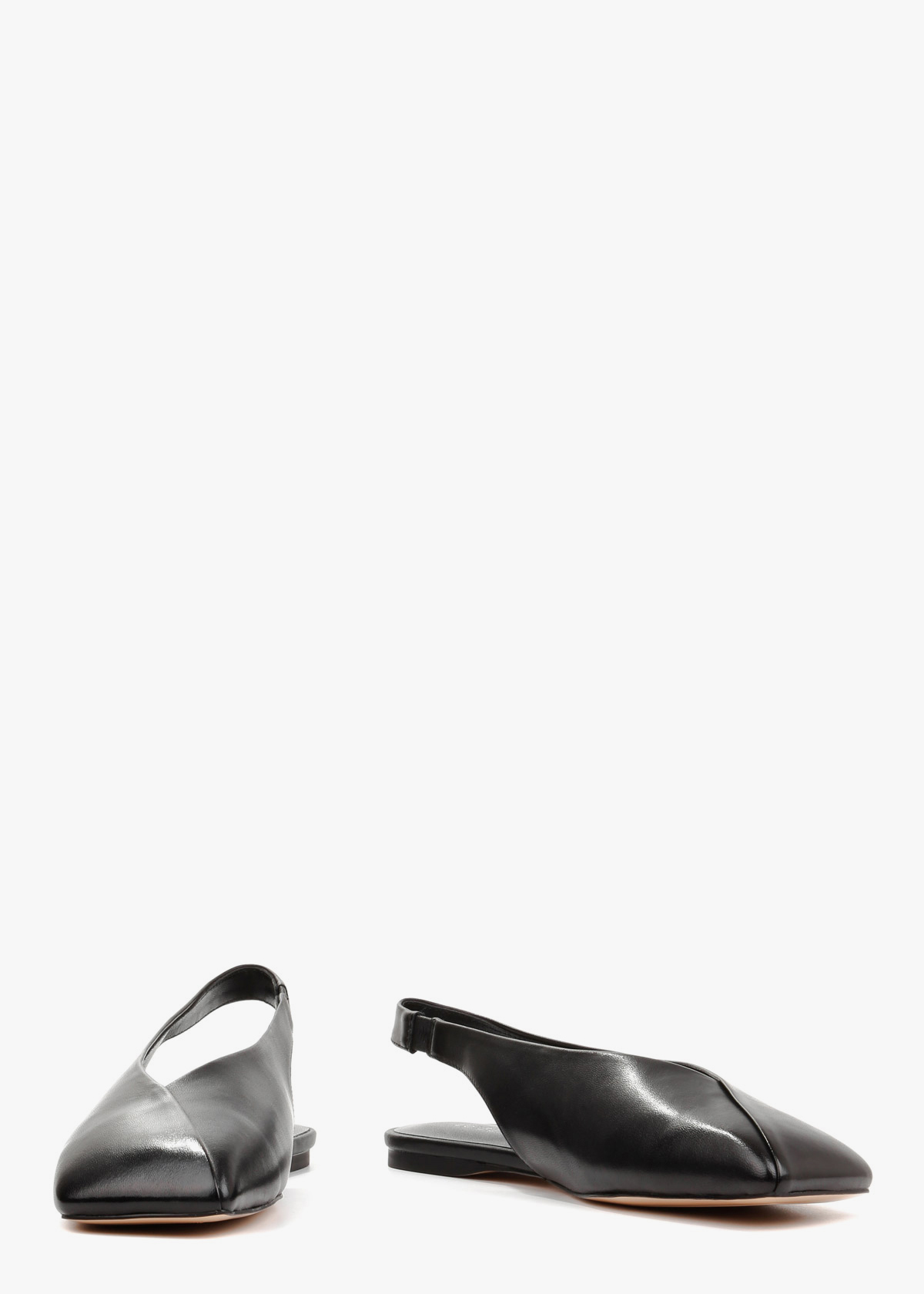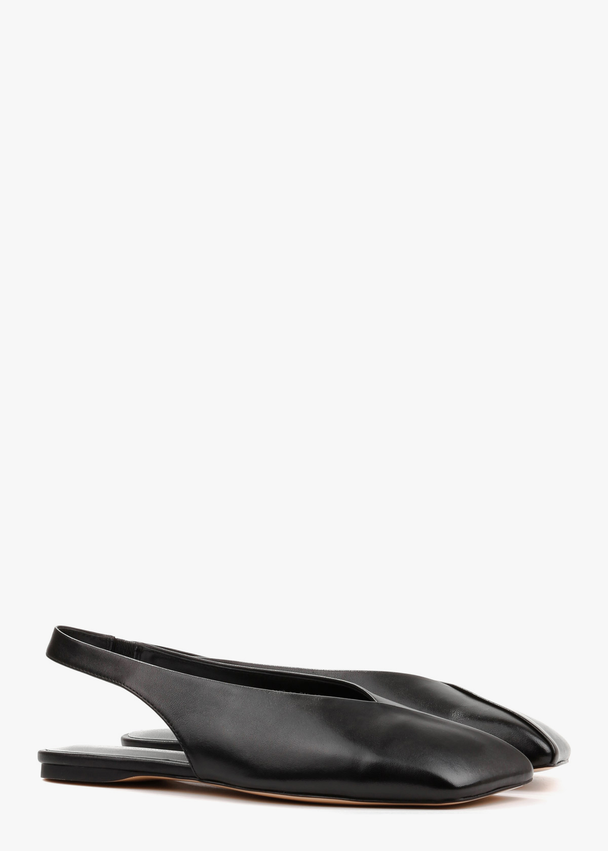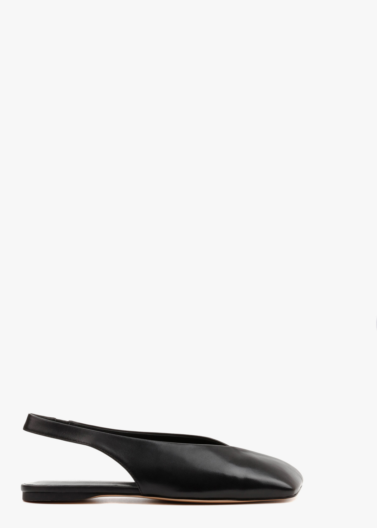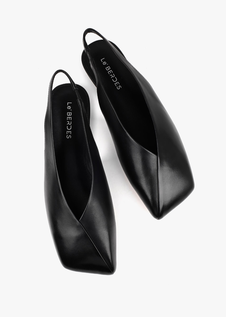 Витончені жіночі сабо з відкритою п'ятою у чорному кольорі, виготовлені з м'якої натуральної шкіри. Модель вирізняється сучасним лаконічним дизайном із закритим квадратним мисом та еластичним ремінцем на заднику для комфортної фіксації. Тонка плоска підошва робить цю пару ідеальним вибором для легких та стильних літніх образів у дусі мінімалізму.
