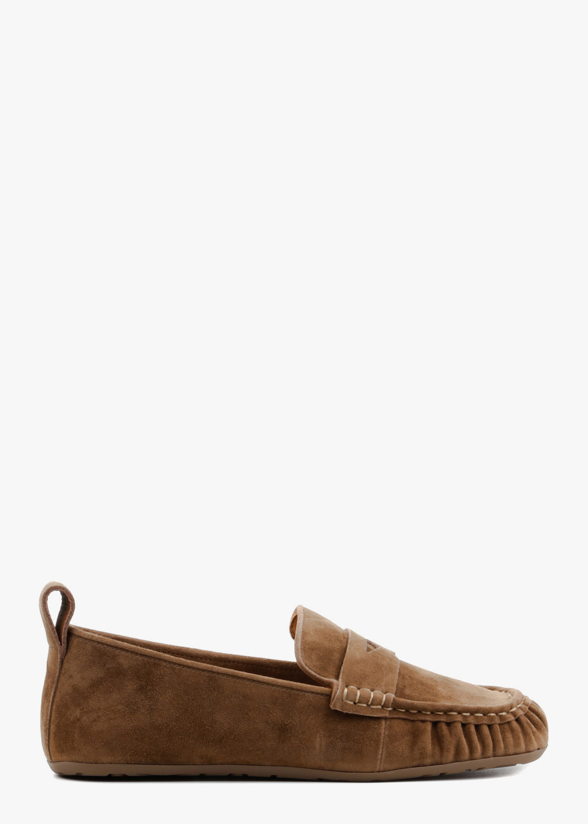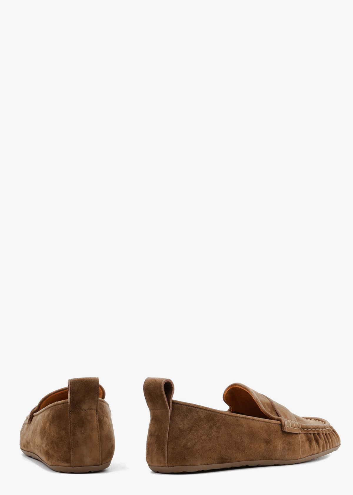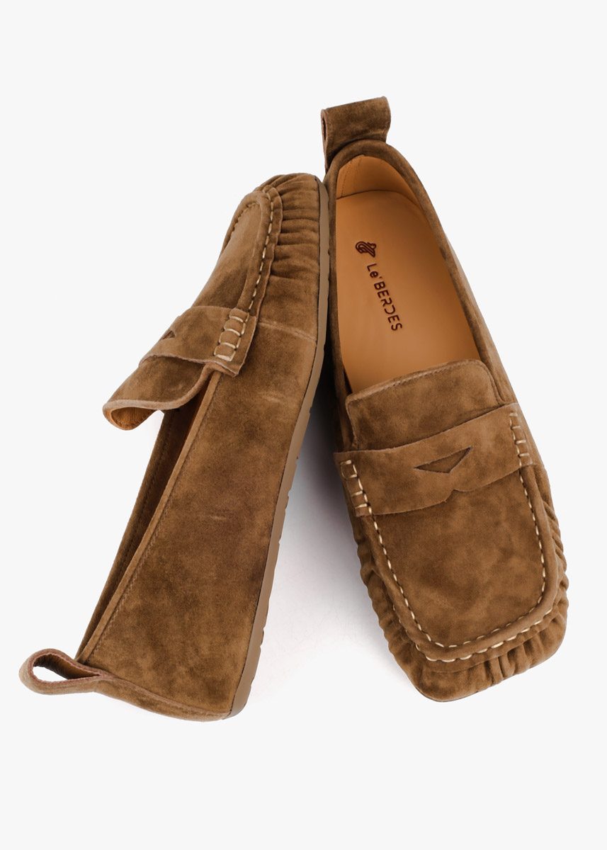Жіночі лофери у стриманому хакі кольорі, виготовлені з м'якої натуральної замші. Модель має класичний дизайн із виразним зовнішнім швом на мисі та декоративною шкіряною перемичкою на підйомі стопи. Тонка гнучка підошва та невелика петля на заднику забезпечують максимальну зручність при взуванні та комфорт під час щоденних прогулянок.