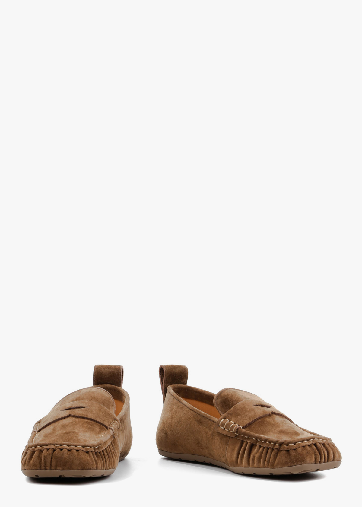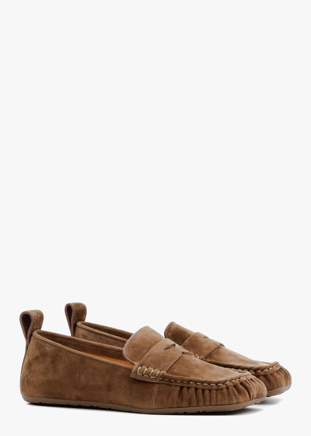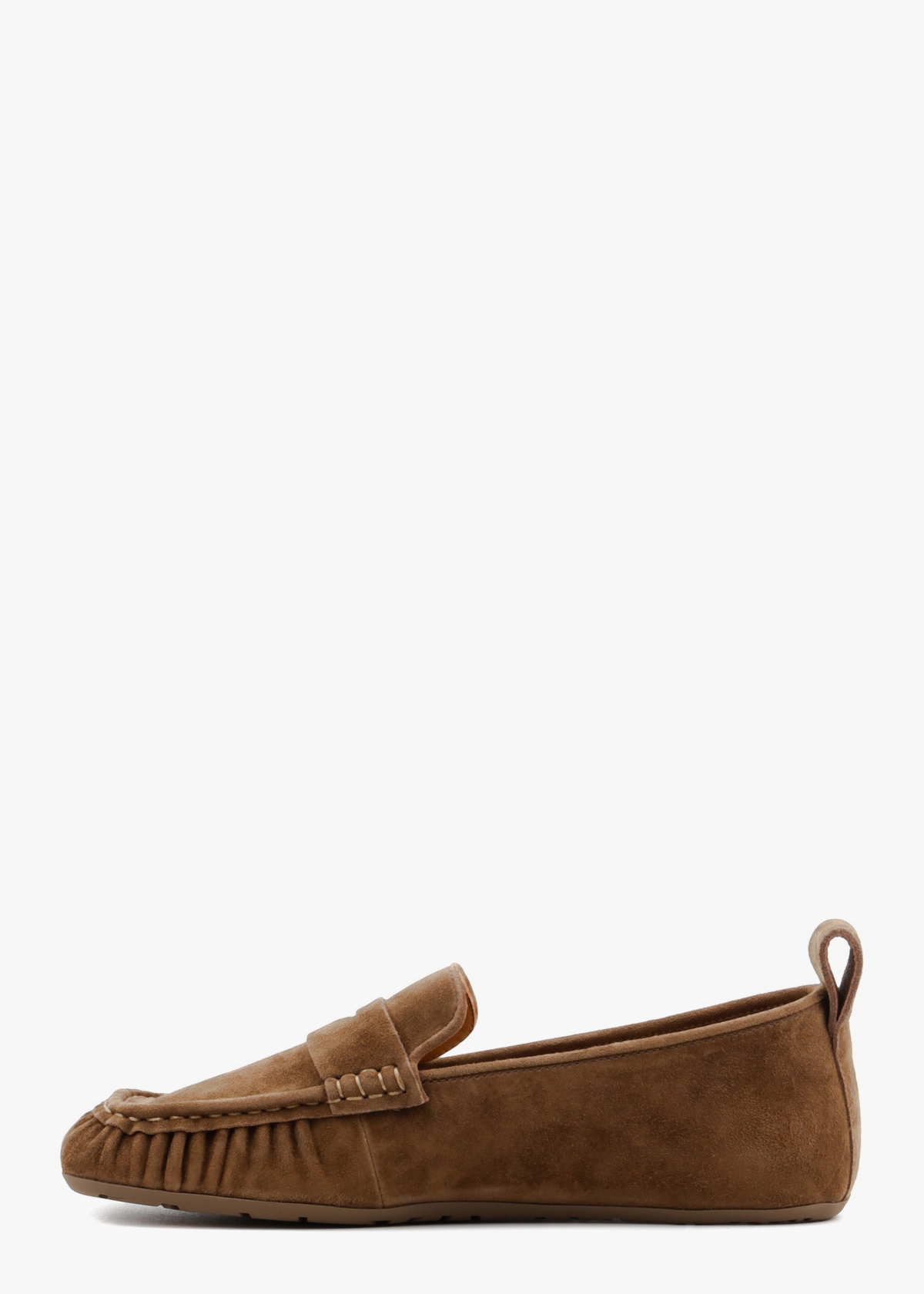 Жіночі лофери у стриманому хакі кольорі, виготовлені з м'якої натуральної замші. Модель має класичний дизайн із виразним зовнішнім швом на мисі та декоративною шкіряною перемичкою на підйомі стопи. Тонка гнучка підошва та невелика петля на заднику забезпечують максимальну зручність при взуванні та комфорт під час щоденних прогулянок.