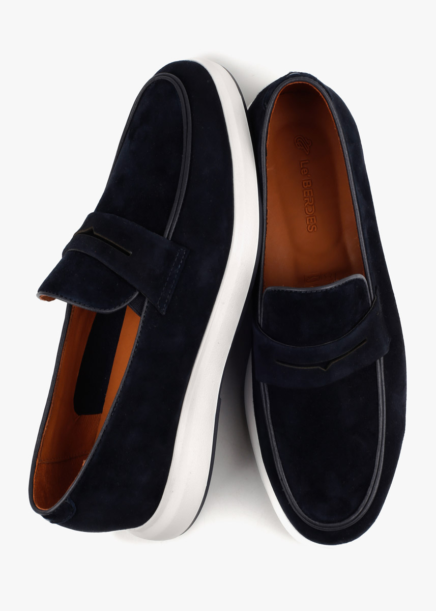 Чоловічі замшеві лофери у темно-синьому кольорі з декоративною перемичкою на підйомі. Виконані з м’якої натуральної замші, мають акуратний силует і зручну посадку. Світла контрастна підошва додає сучасного вигляду та робить модель універсальною для щоденного носіння. Гарно поєднуються з джинсами, класичними брюками та літніми костюмами.