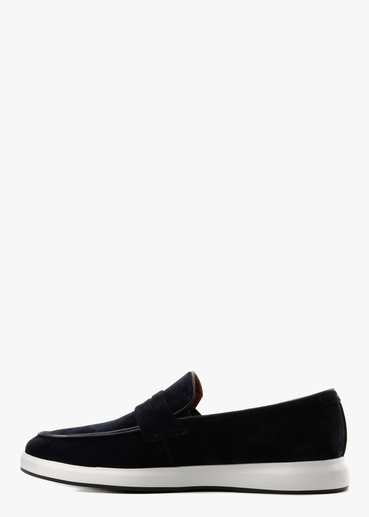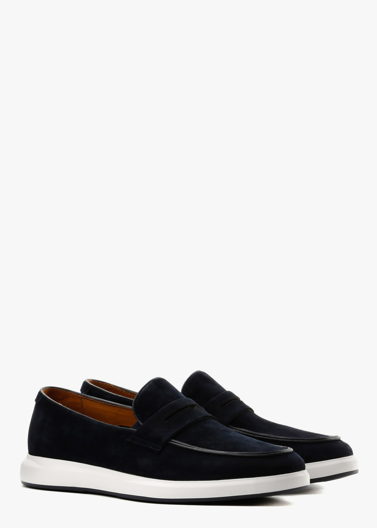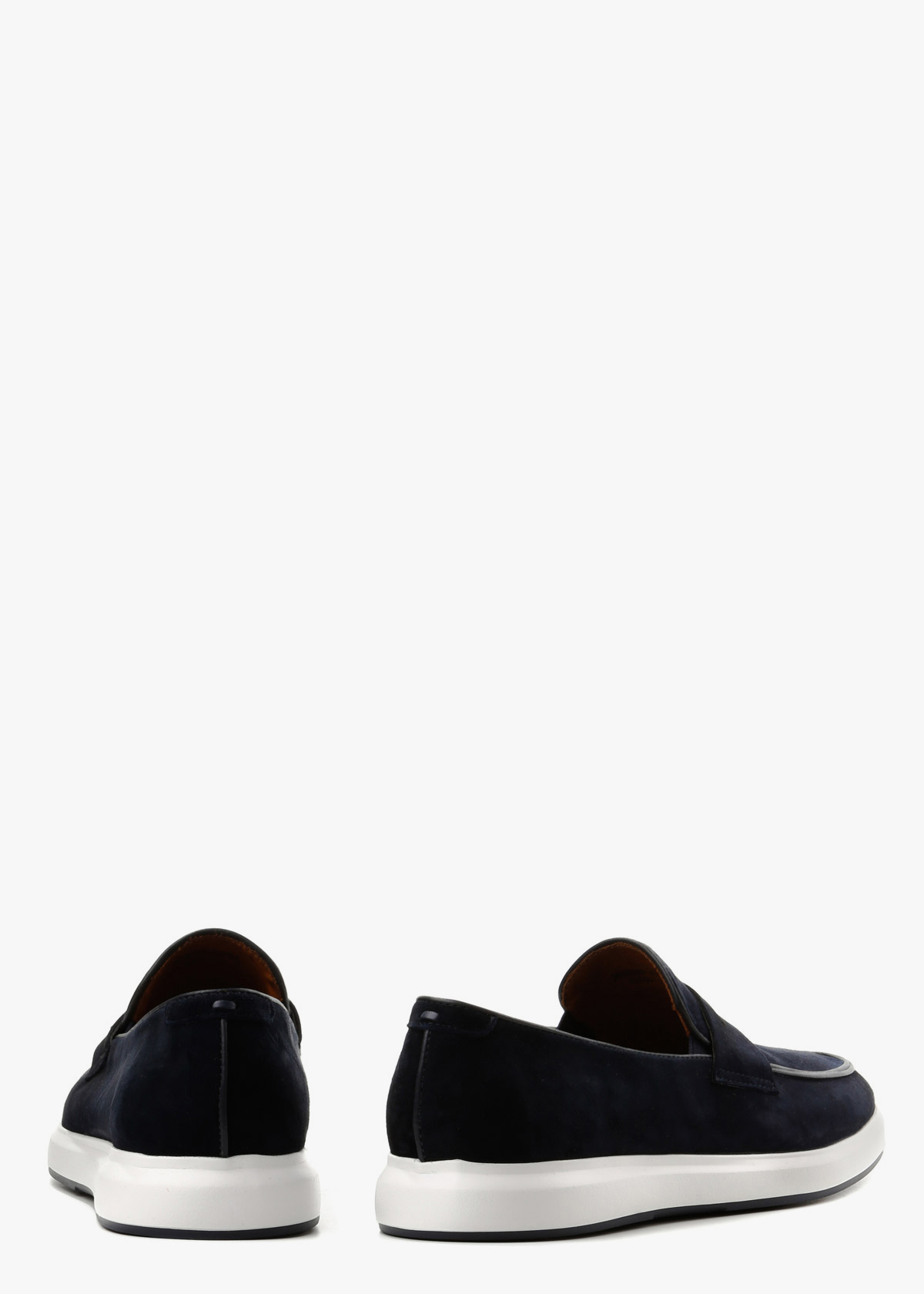 Чоловічі замшеві лофери у темно-синьому кольорі з декоративною перемичкою на підйомі. Виконані з м’якої натуральної замші, мають акуратний силует і зручну посадку. Світла контрастна підошва додає сучасного вигляду та робить модель універсальною для щоденного носіння. Гарно поєднуються з джинсами, класичними брюками та літніми костюмами.