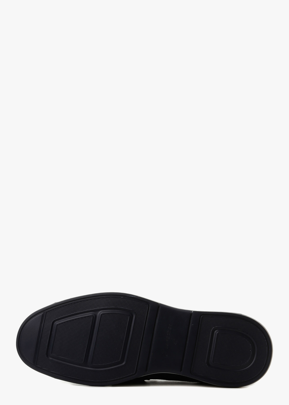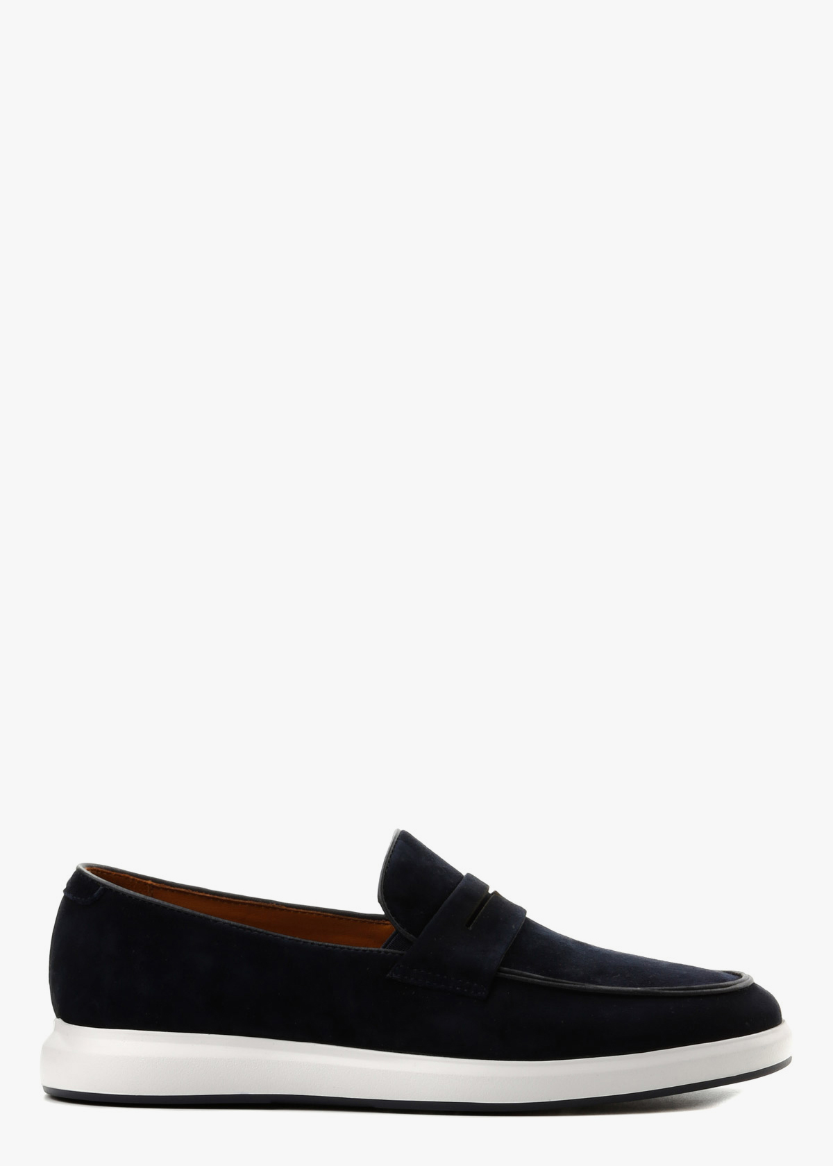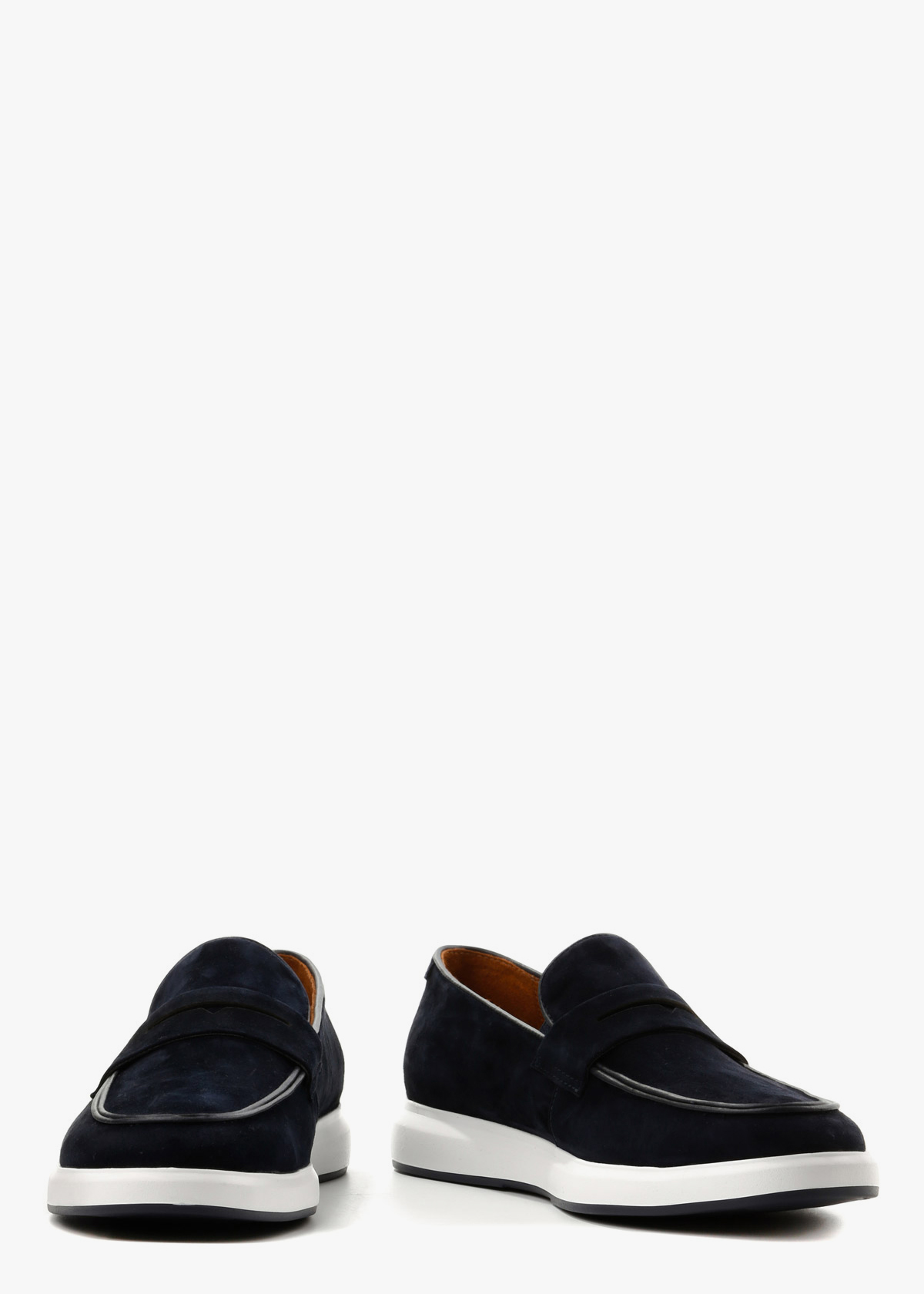Чоловічі замшеві лофери у темно-синьому кольорі з декоративною перемичкою на підйомі. Виконані з м’якої натуральної замші, мають акуратний силует і зручну посадку. Світла контрастна підошва додає сучасного вигляду та робить модель універсальною для щоденного носіння. Гарно поєднуються з джинсами, класичними брюками та літніми костюмами.