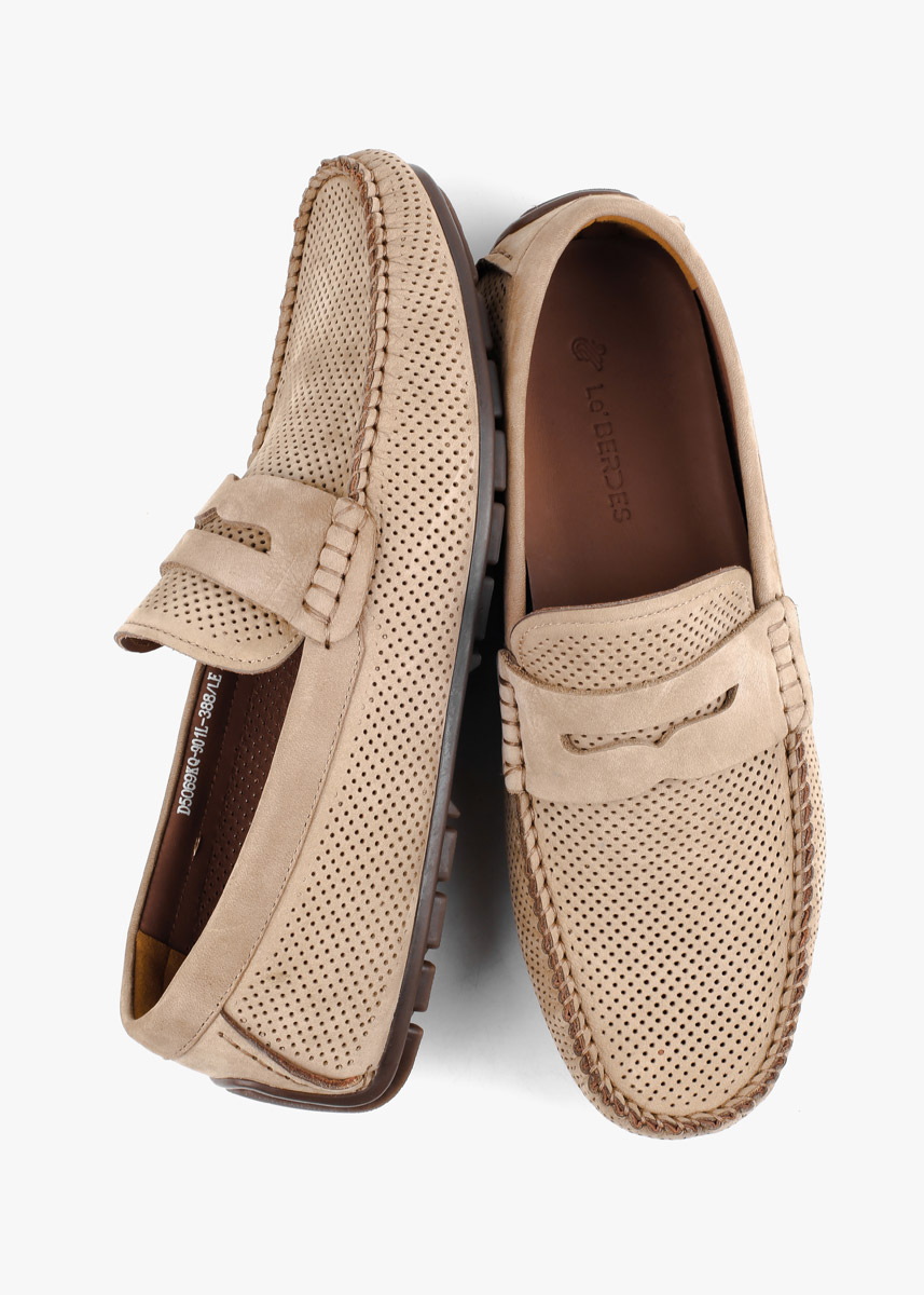Чоловічі бежеві мокасіни виготовлені з м'якого нубука з наскрізною перфорацією, що сприяє активній циркуляції повітря. Модель має класичний закруглений мис із об’ємним швом та декоративну поперечну вставку на підйомі стопи. Гнучка коричнева підошва на пласкому ходу з рельєфним протектором забезпечує надійне зчеплення з поверхнею та легкість рухів. Таке взуття є практичним рішенням для тривалих прогулянок і щоденного носіння.