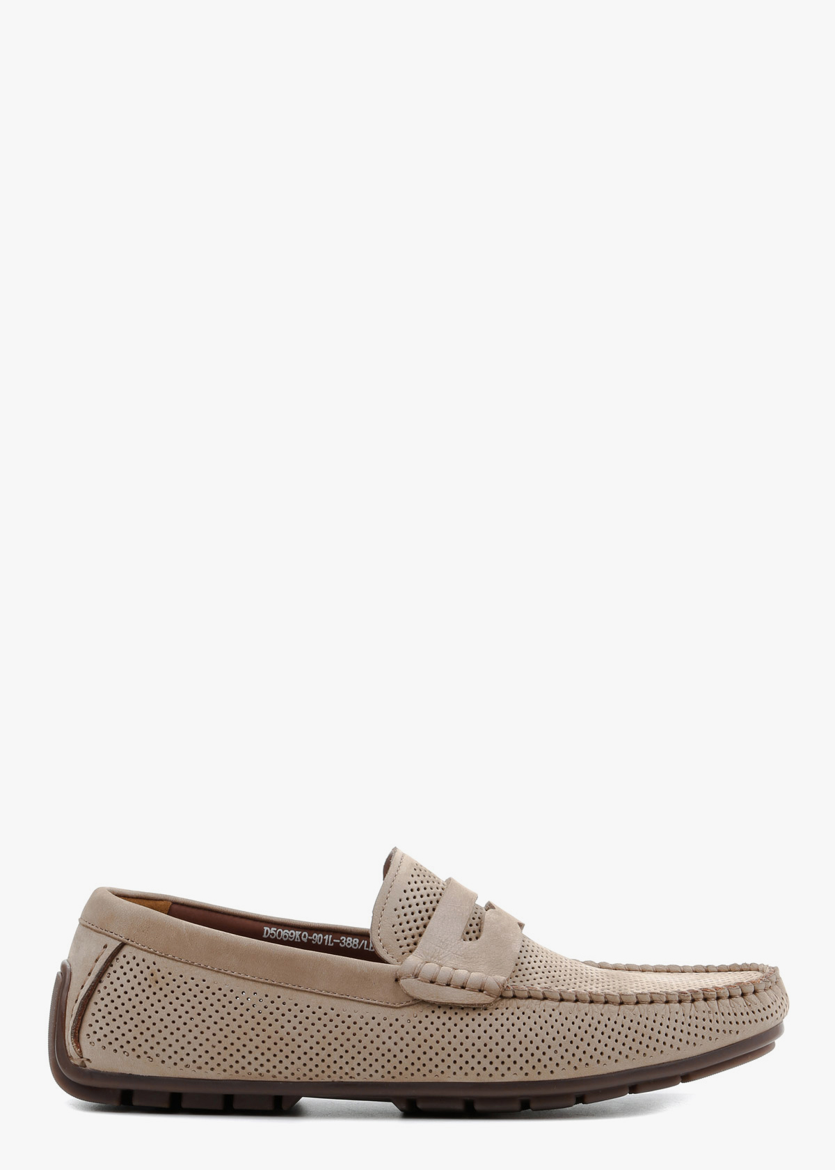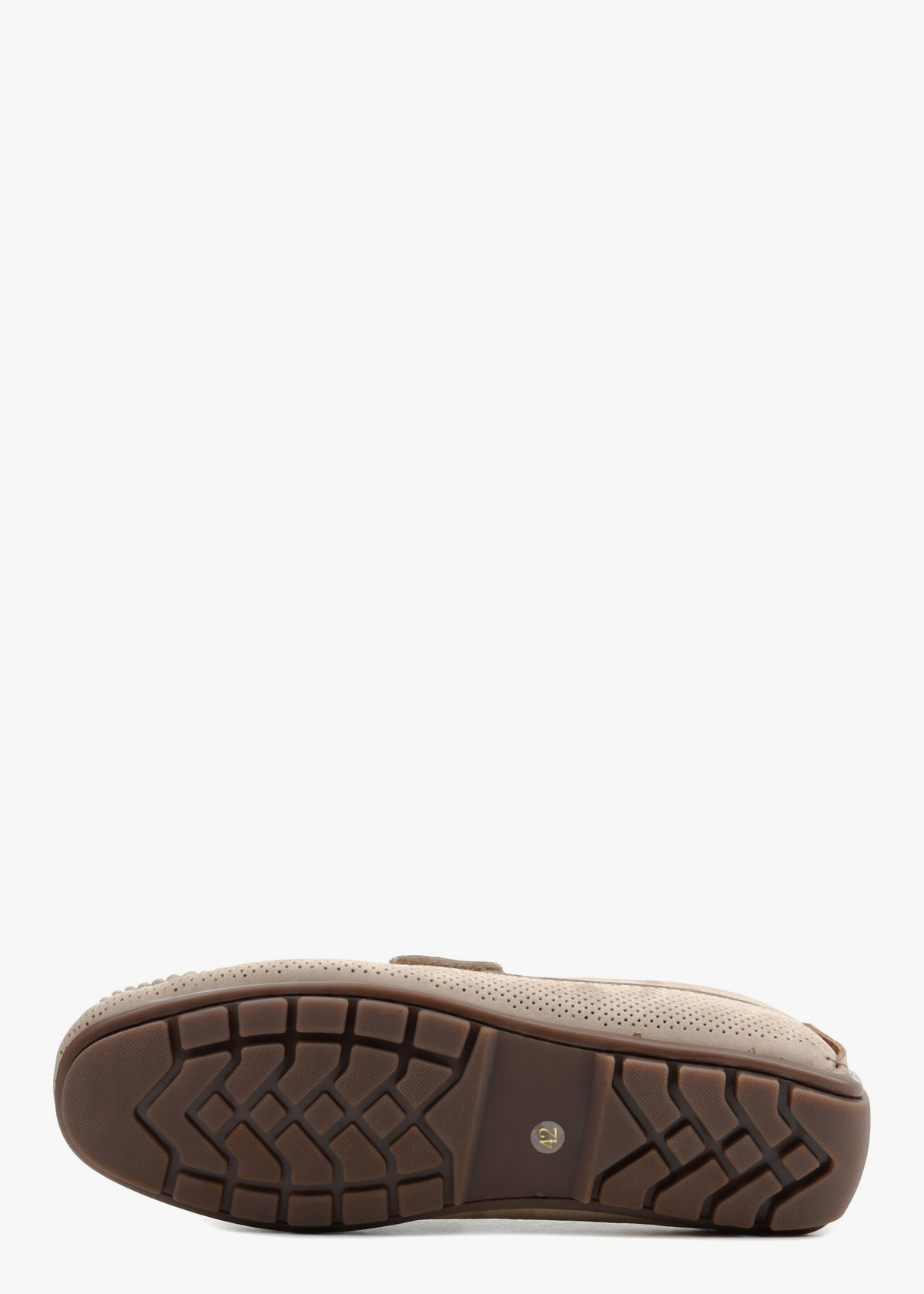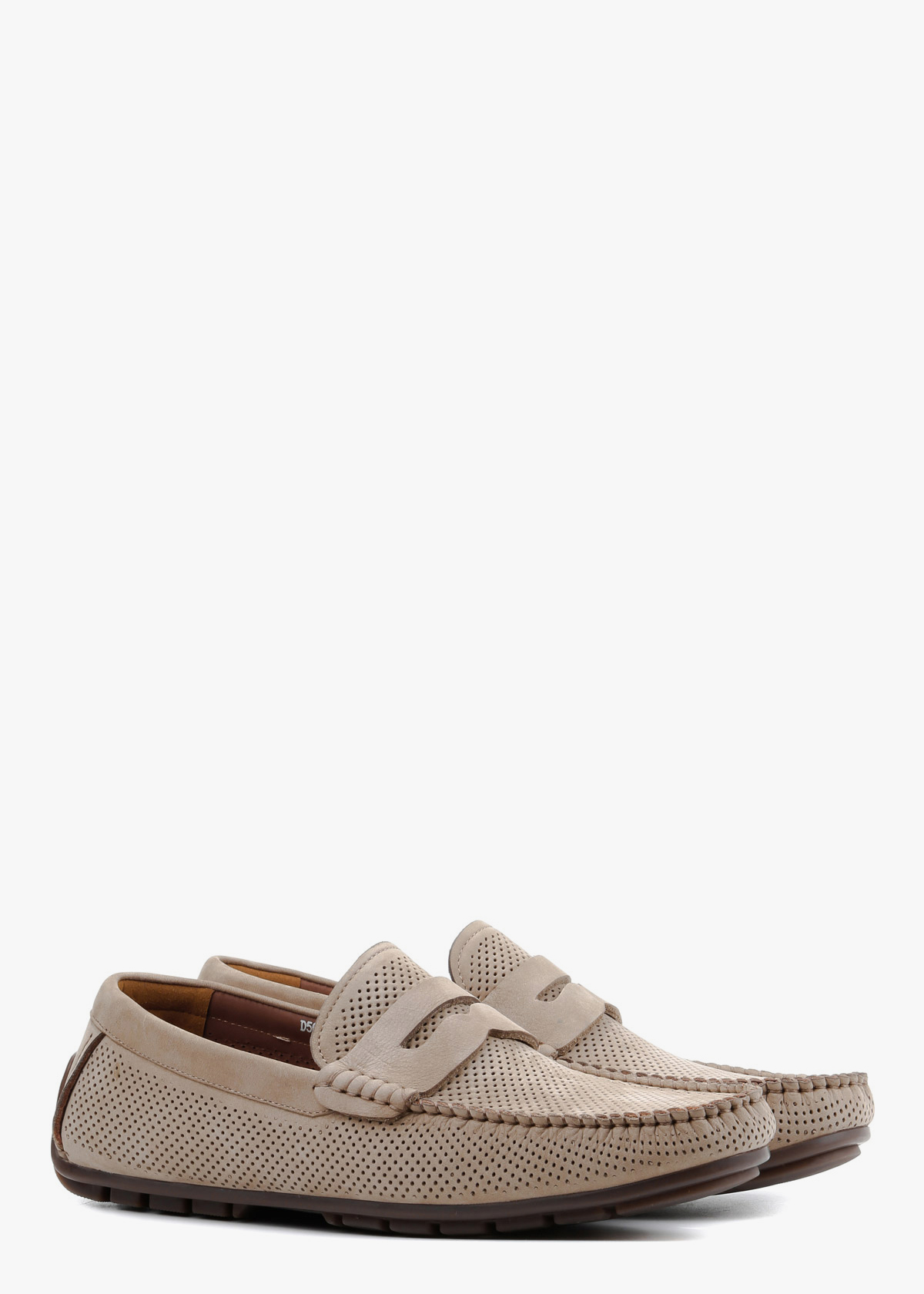 Чоловічі бежеві мокасіни виготовлені з м'якого нубука з наскрізною перфорацією, що сприяє активній циркуляції повітря. Модель має класичний закруглений мис із об’ємним швом та декоративну поперечну вставку на підйомі стопи. Гнучка коричнева підошва на пласкому ходу з рельєфним протектором забезпечує надійне зчеплення з поверхнею та легкість рухів. Таке взуття є практичним рішенням для тривалих прогулянок і щоденного носіння.