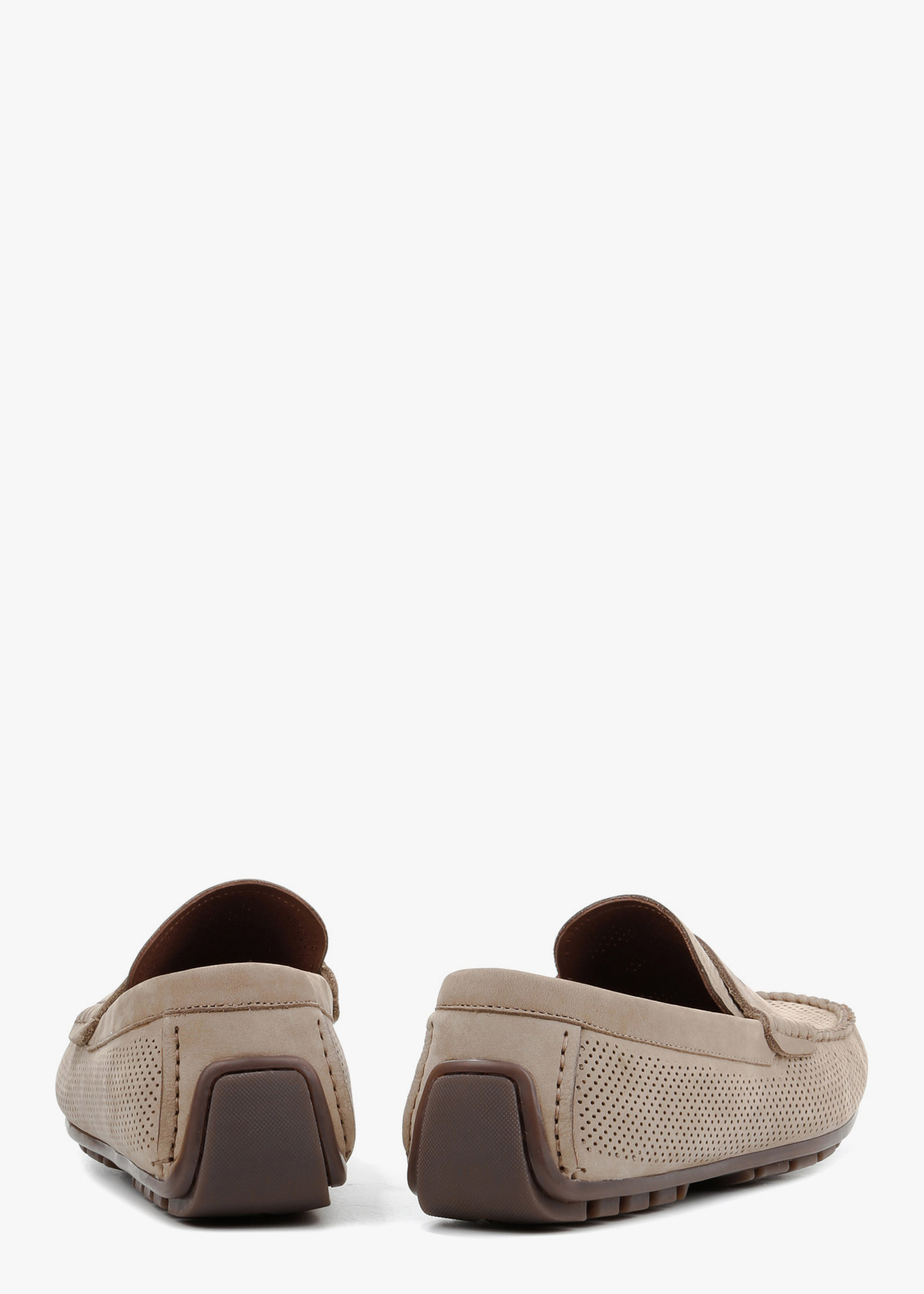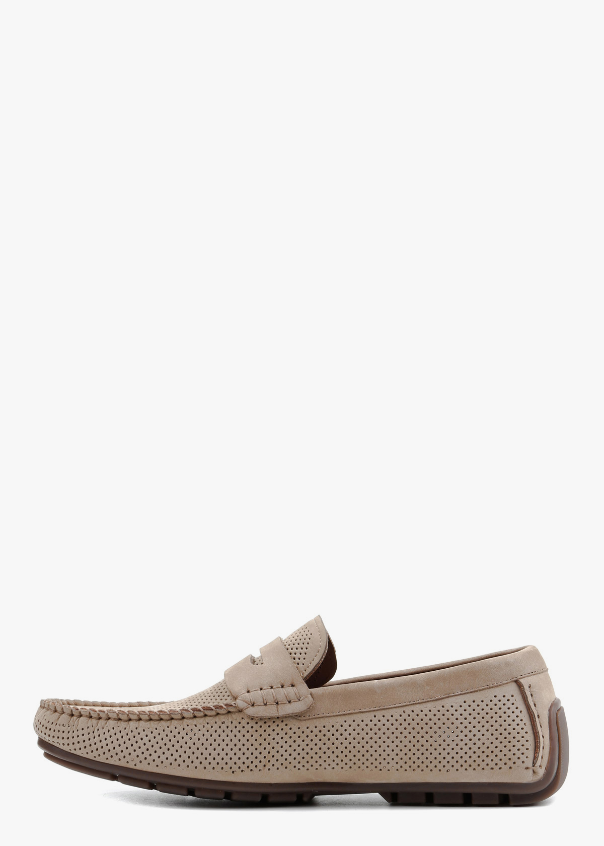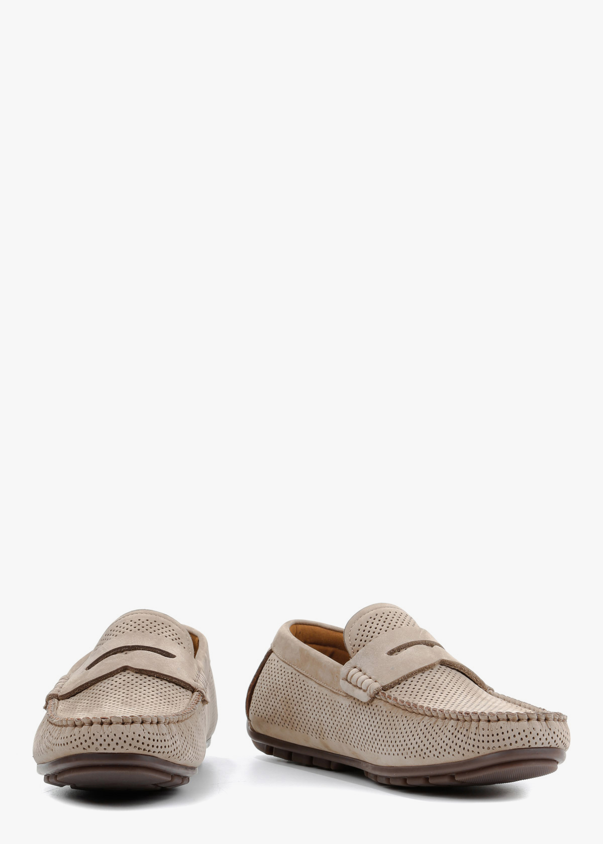 Чоловічі бежеві мокасіни виготовлені з м'якого нубука з наскрізною перфорацією, що сприяє активній циркуляції повітря. Модель має класичний закруглений мис із об’ємним швом та декоративну поперечну вставку на підйомі стопи. Гнучка коричнева підошва на пласкому ходу з рельєфним протектором забезпечує надійне зчеплення з поверхнею та легкість рухів. Таке взуття є практичним рішенням для тривалих прогулянок і щоденного носіння.