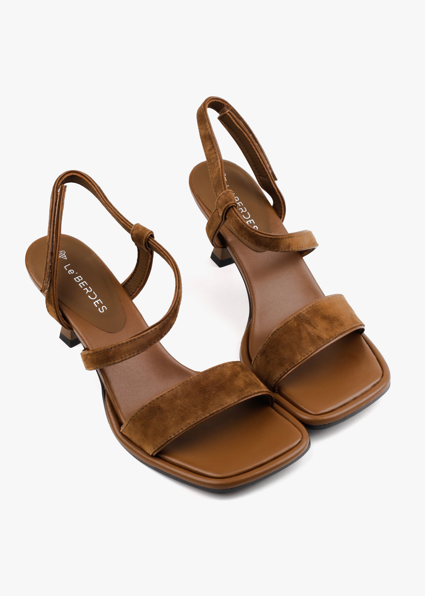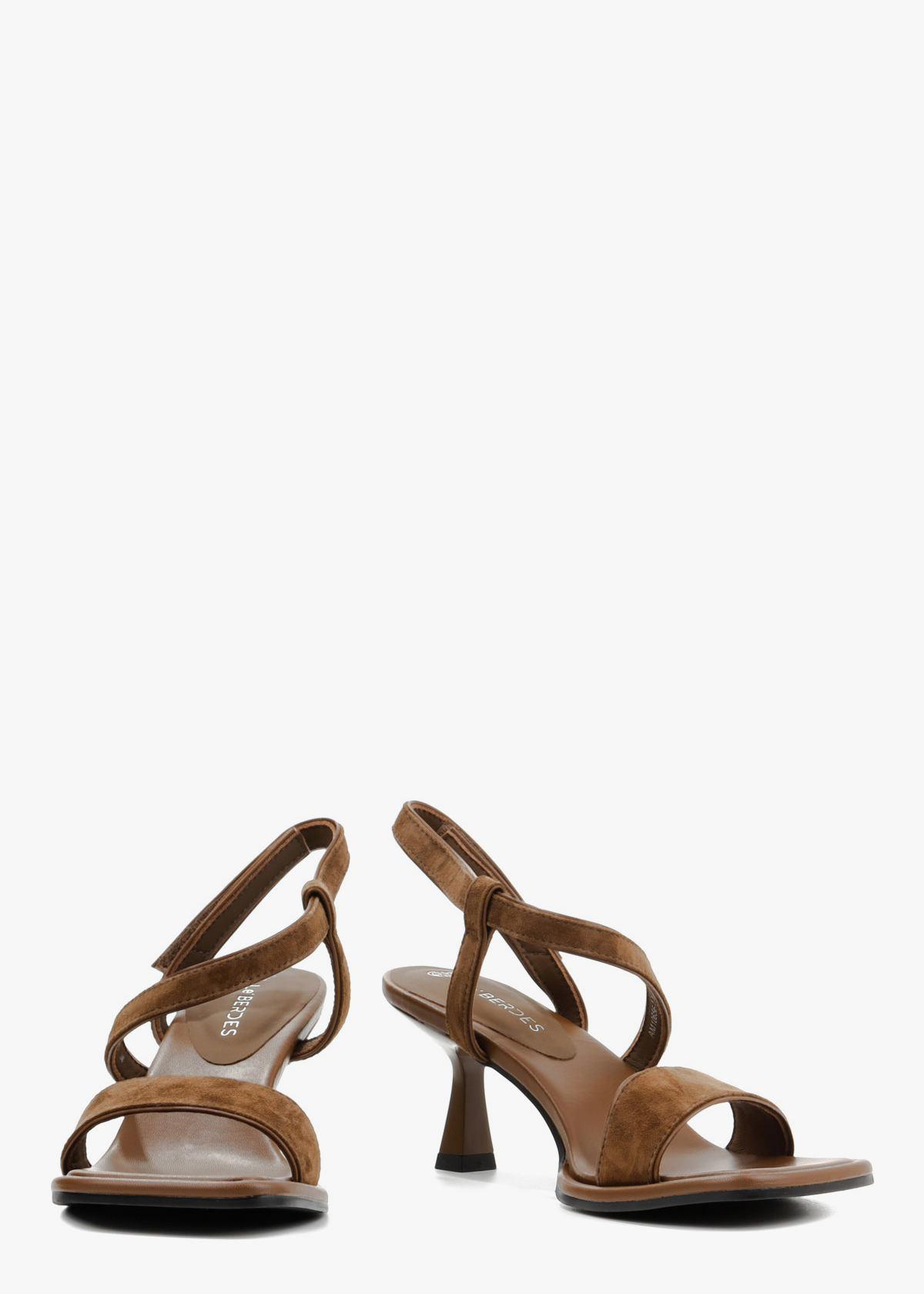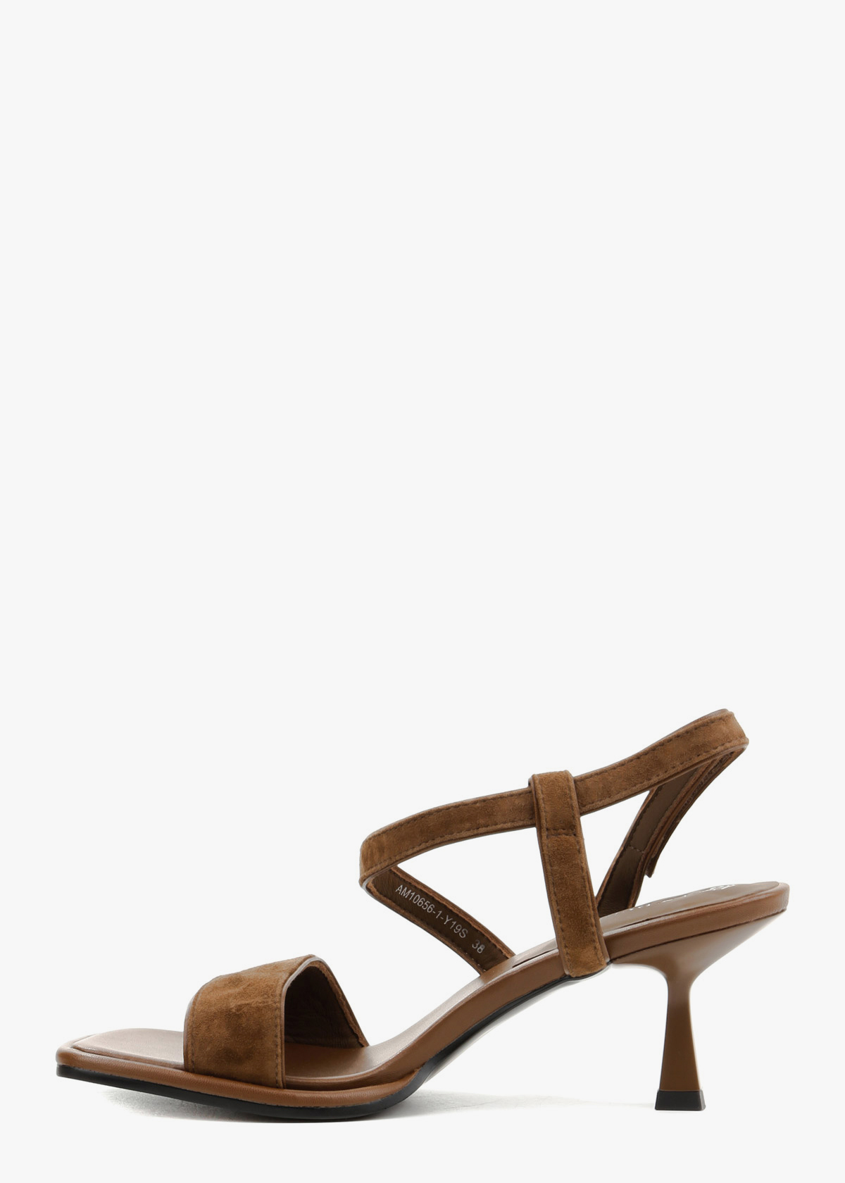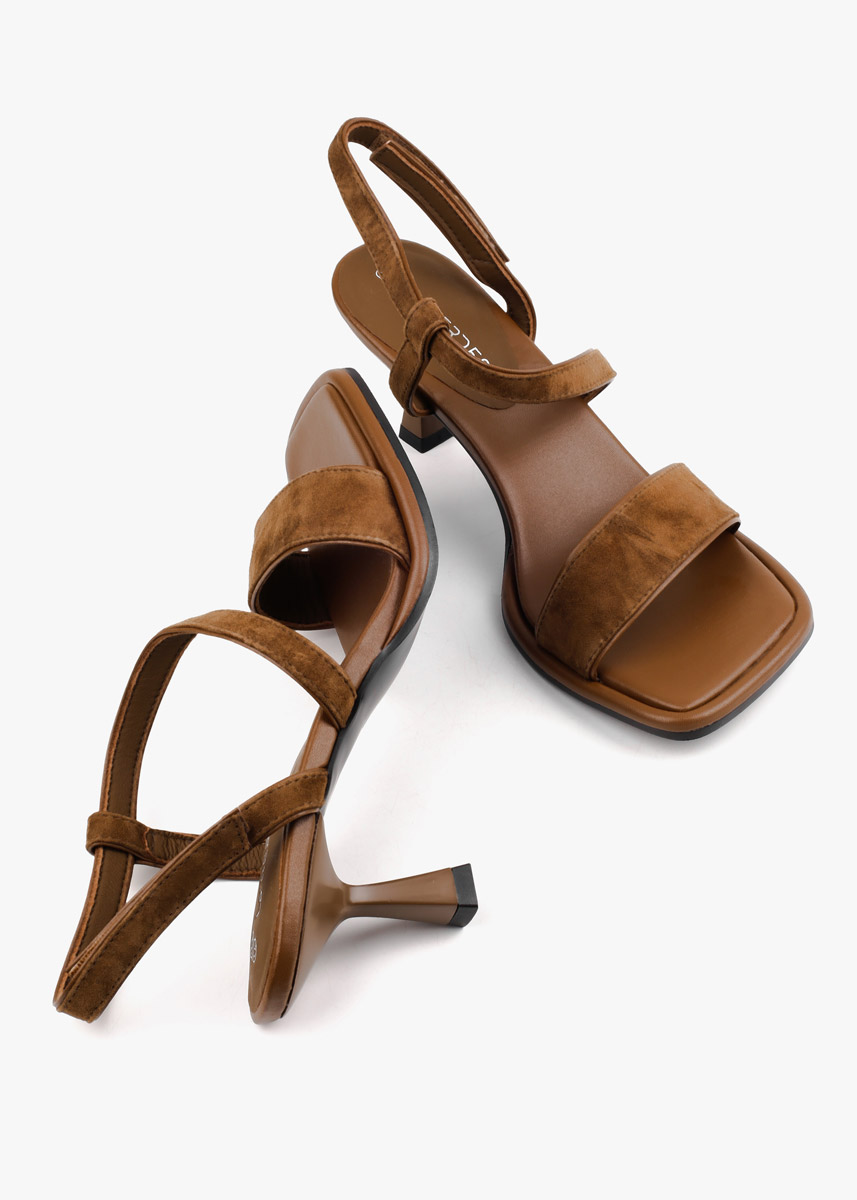 Босоніжки у коричневому кольорі гармонійно поєднують фактурну замшу та гладку шкіру. Модель відкритого типу доповнена витонченим підбором середньої висоти та трендовим квадратним мисом із м’яким кантом. Система тонких ремінців, що перехрещуються на підйомі, та еластична вставка на п’яті забезпечують надійну фіксацію та комфортну посадку. Стриманий дизайн і благородний відтінок роблять це взуття вдалим доповненням до вашого образу.