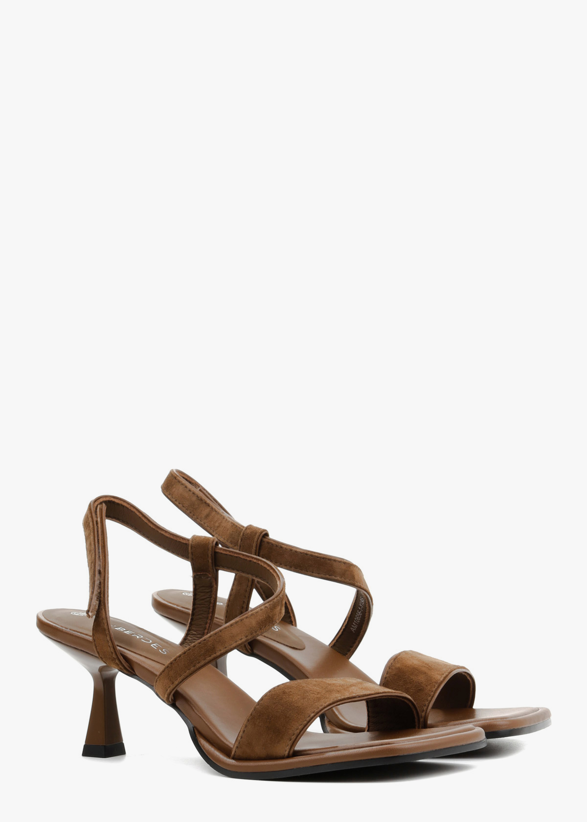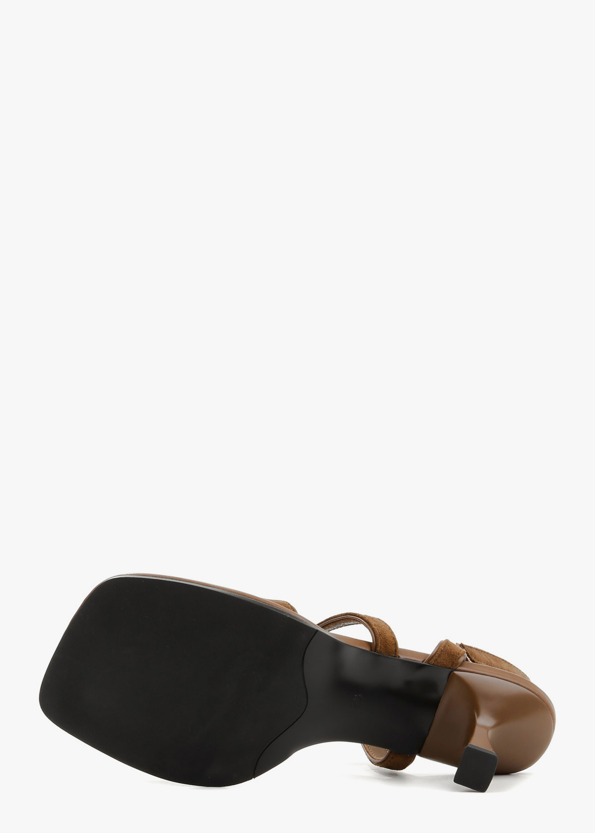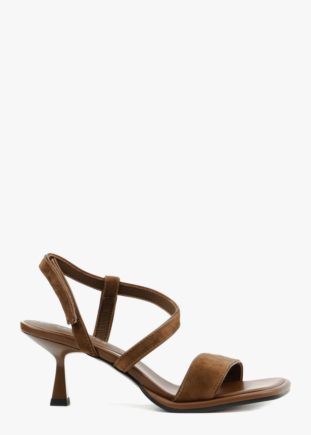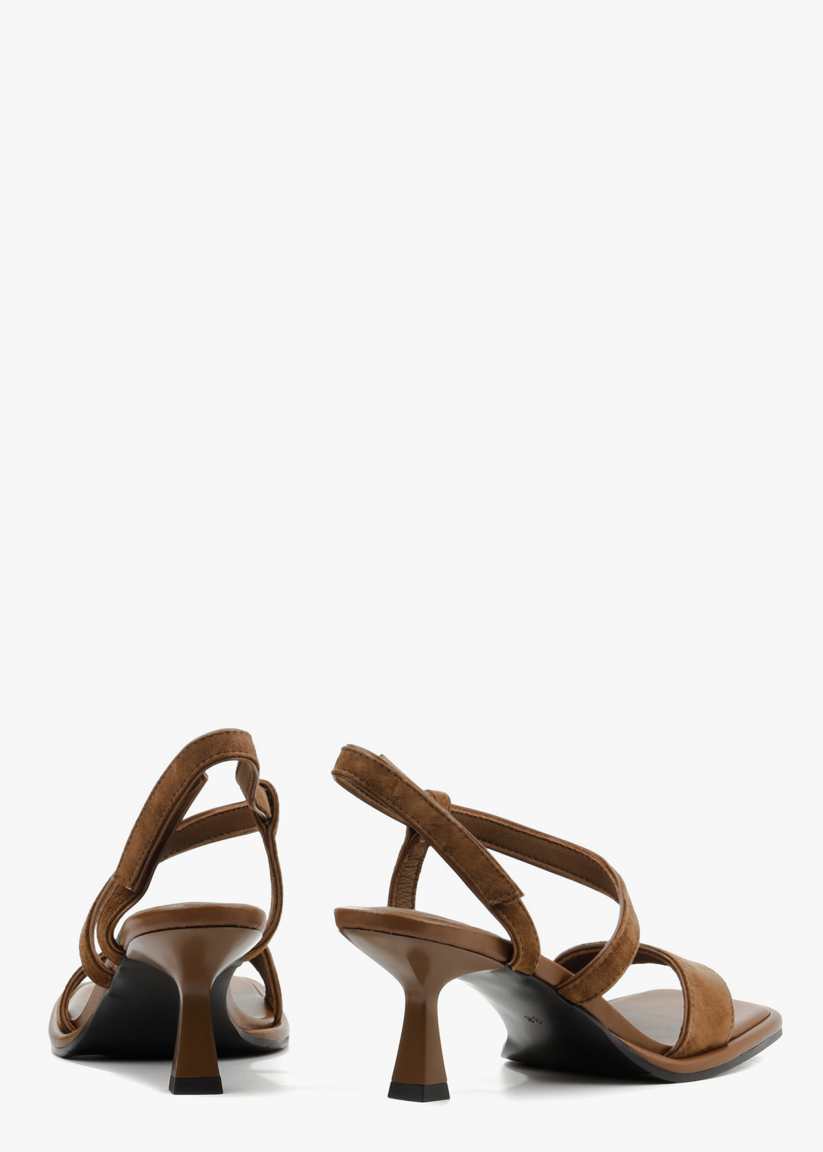 Босоніжки у коричневому кольорі гармонійно поєднують фактурну замшу та гладку шкіру. Модель відкритого типу доповнена витонченим підбором середньої висоти та трендовим квадратним мисом із м’яким кантом. Система тонких ремінців, що перехрещуються на підйомі, та еластична вставка на п’яті забезпечують надійну фіксацію та комфортну посадку. Стриманий дизайн і благородний відтінок роблять це взуття вдалим доповненням до вашого образу.