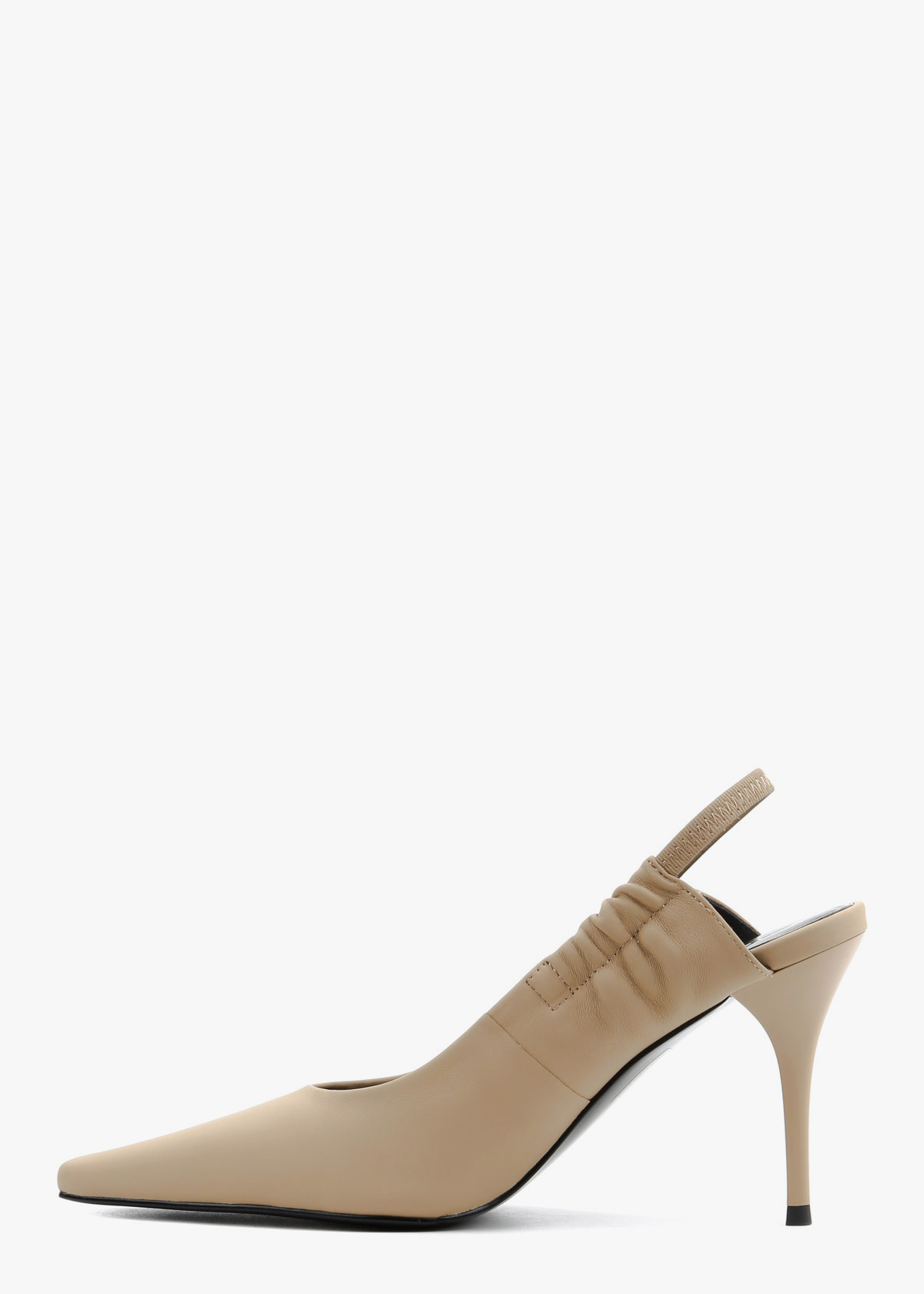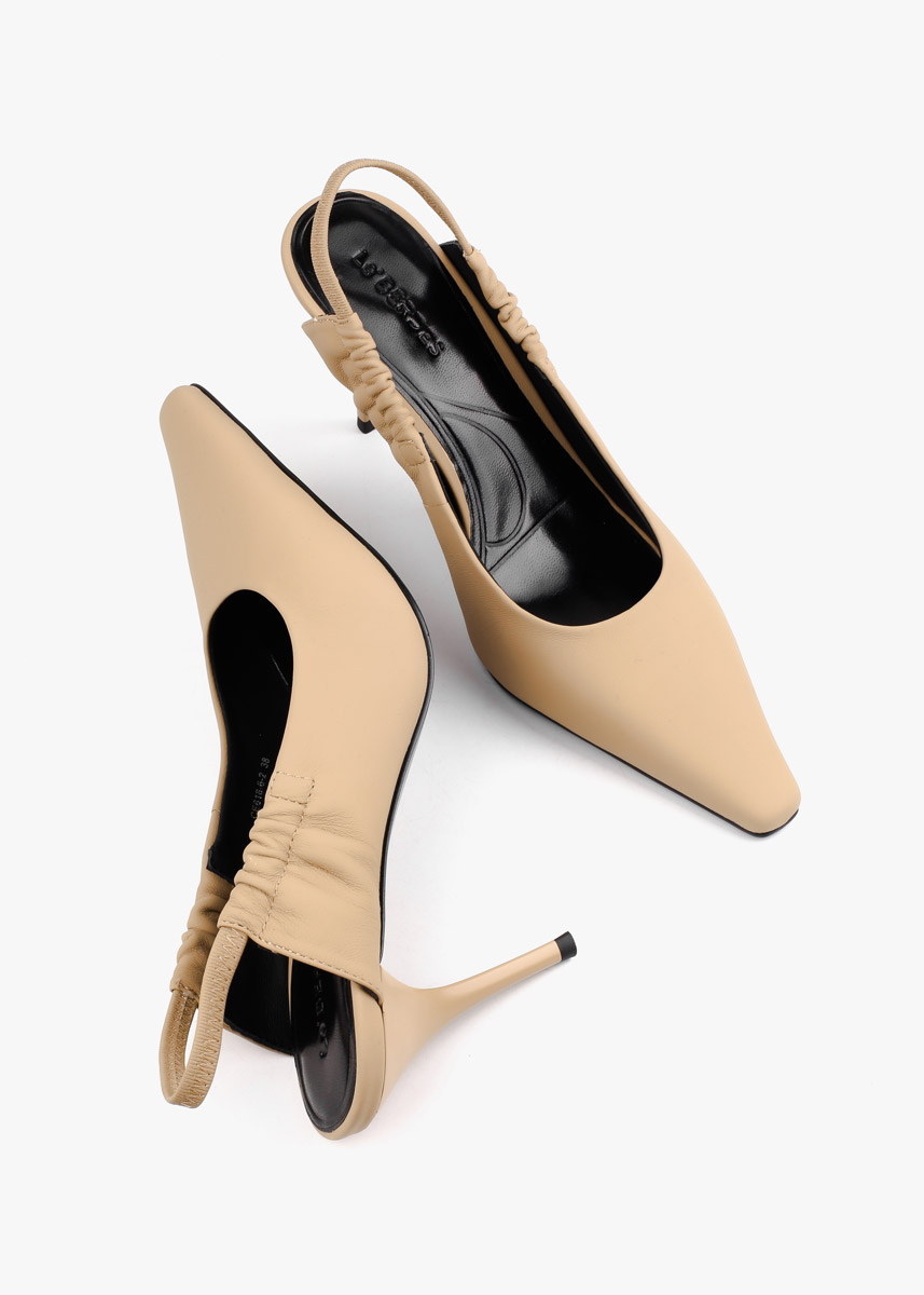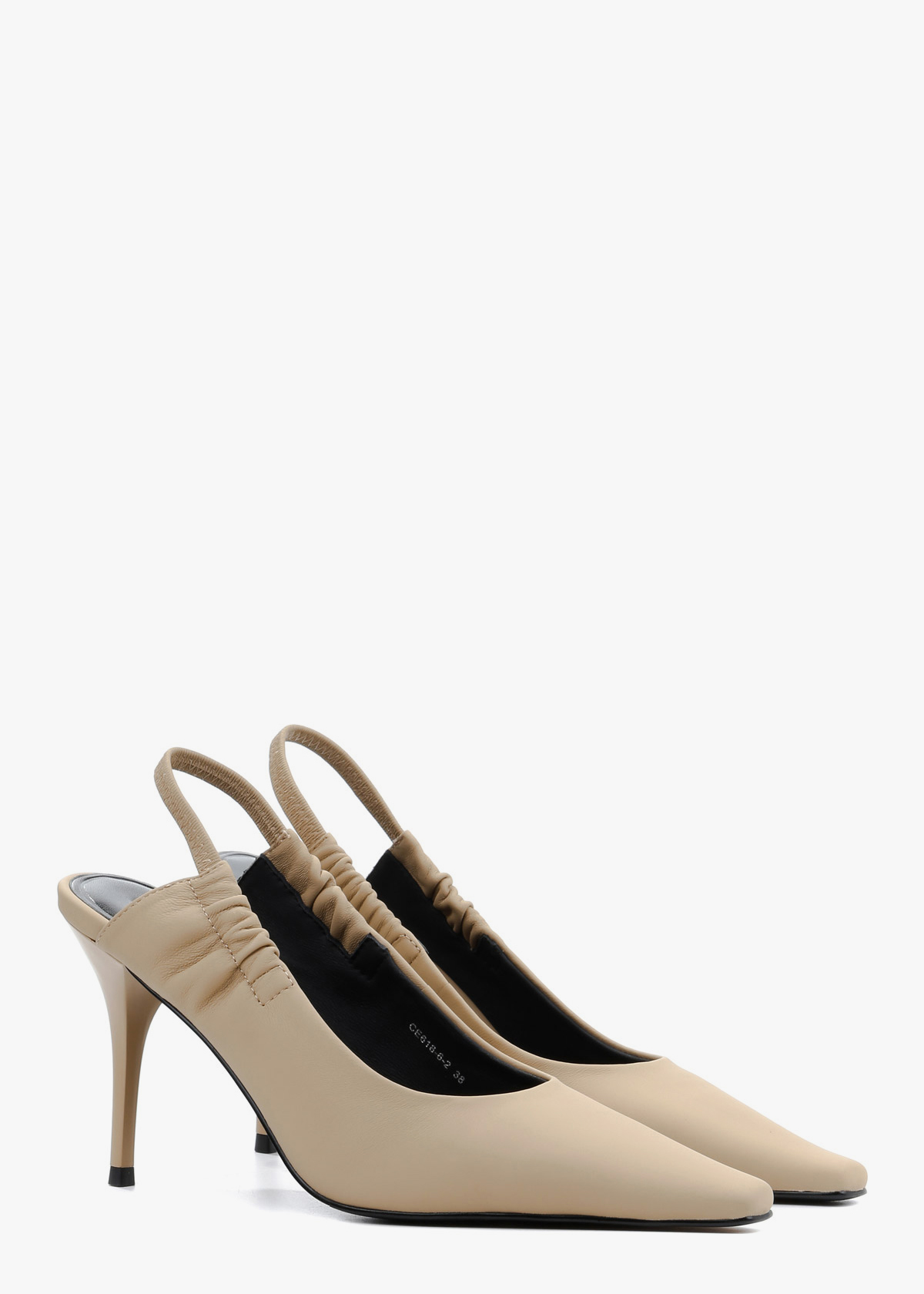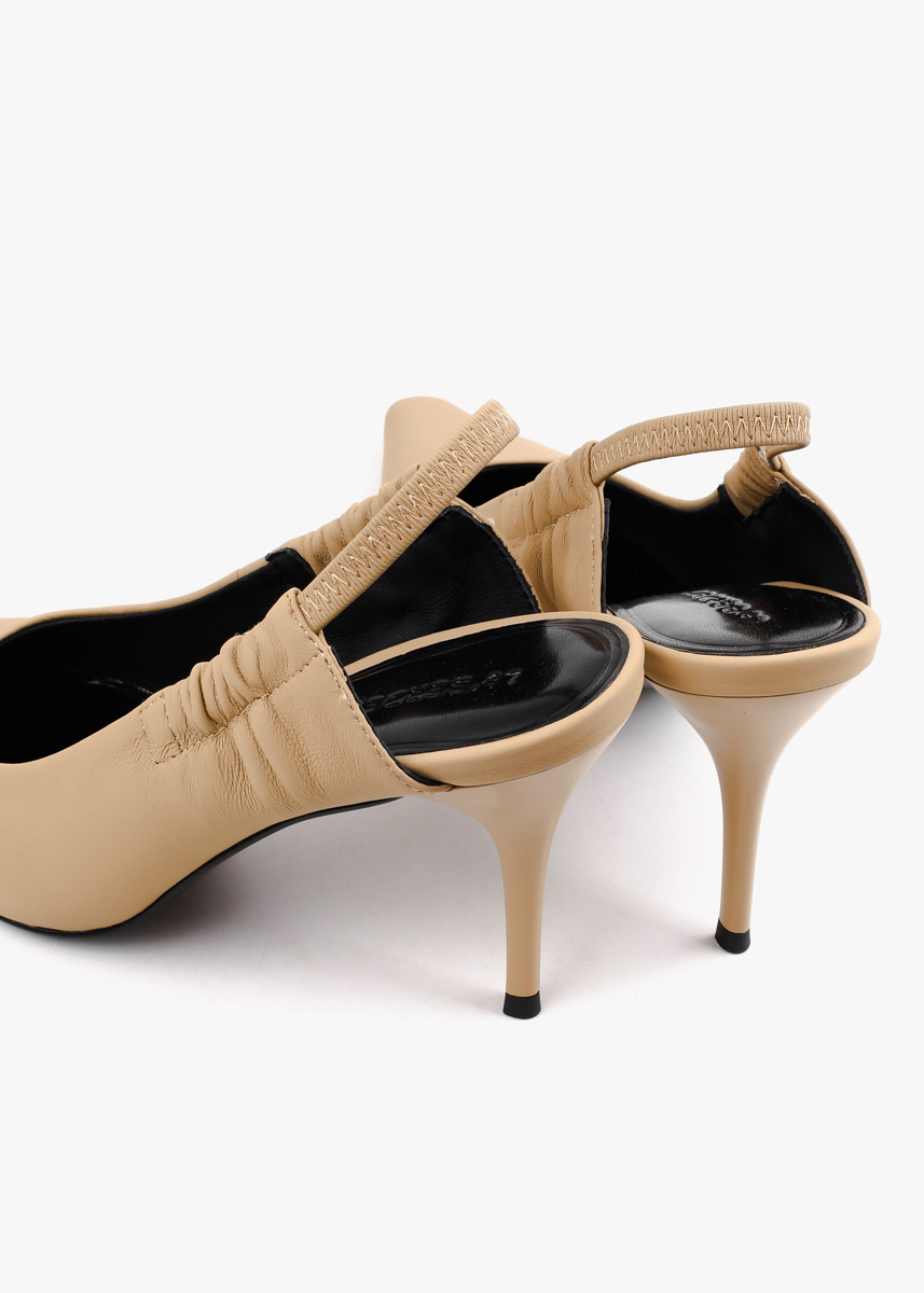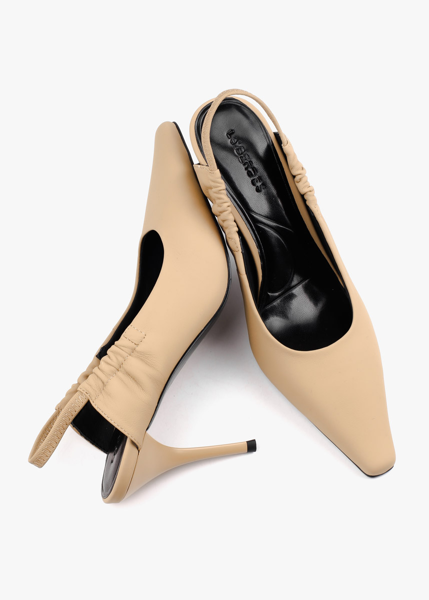 Жіночі сабо виконані з гладкої натуральної шкіри класичного бежевого кольору. Модель має витончений загострений мис та еластичний ремінець на заднику, що забезпечує комфортну посадку без зайвих застібок. Високий підбор-шпилька додає силуету жіночності, роблячи ці туфлі універсальним доповненням як до ділового костюма, так і до вечірньої сукні.
