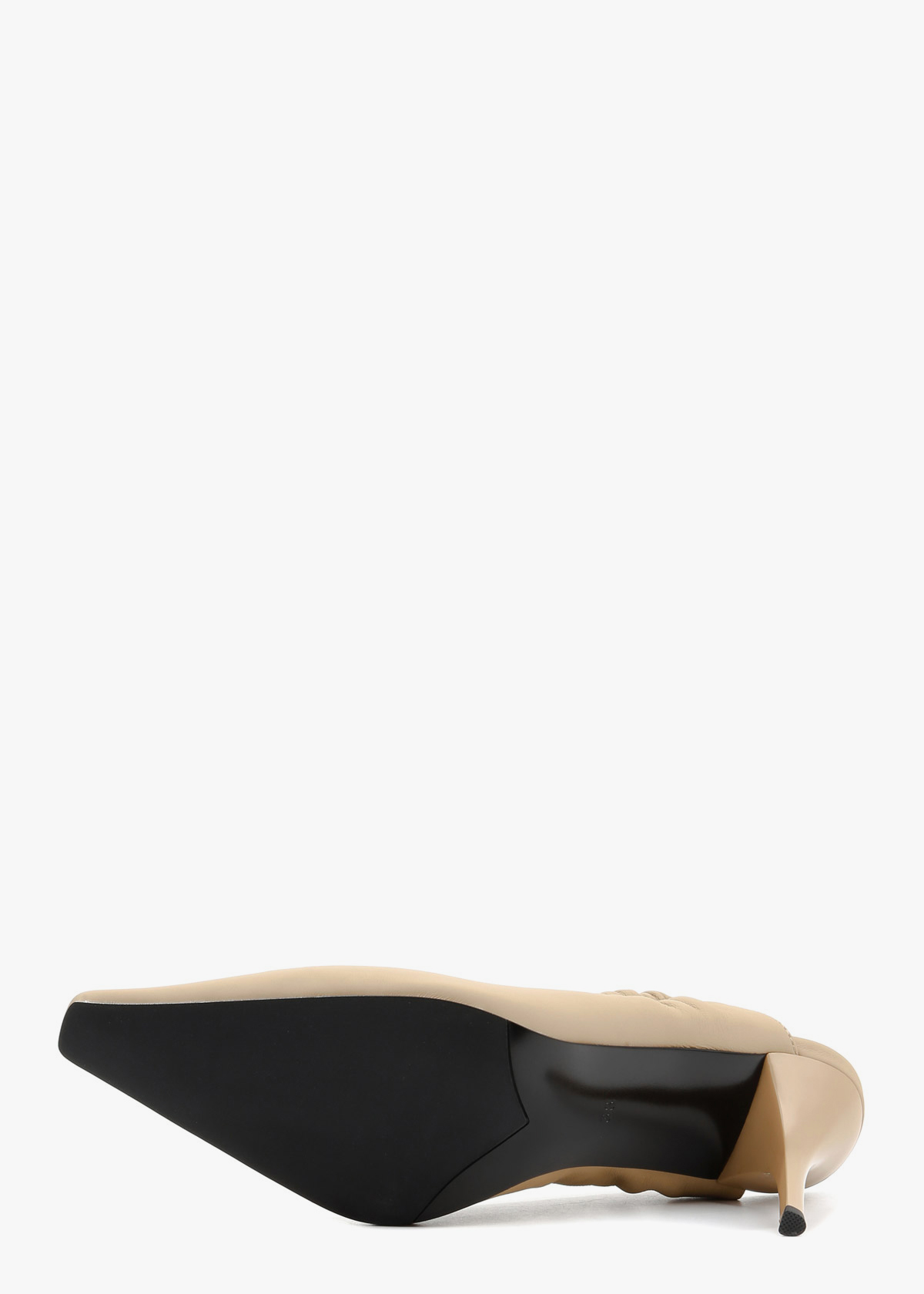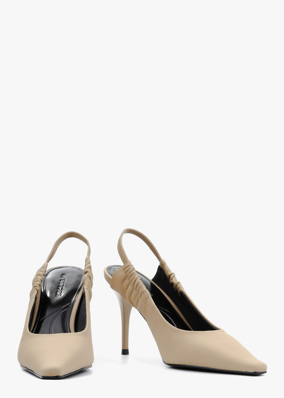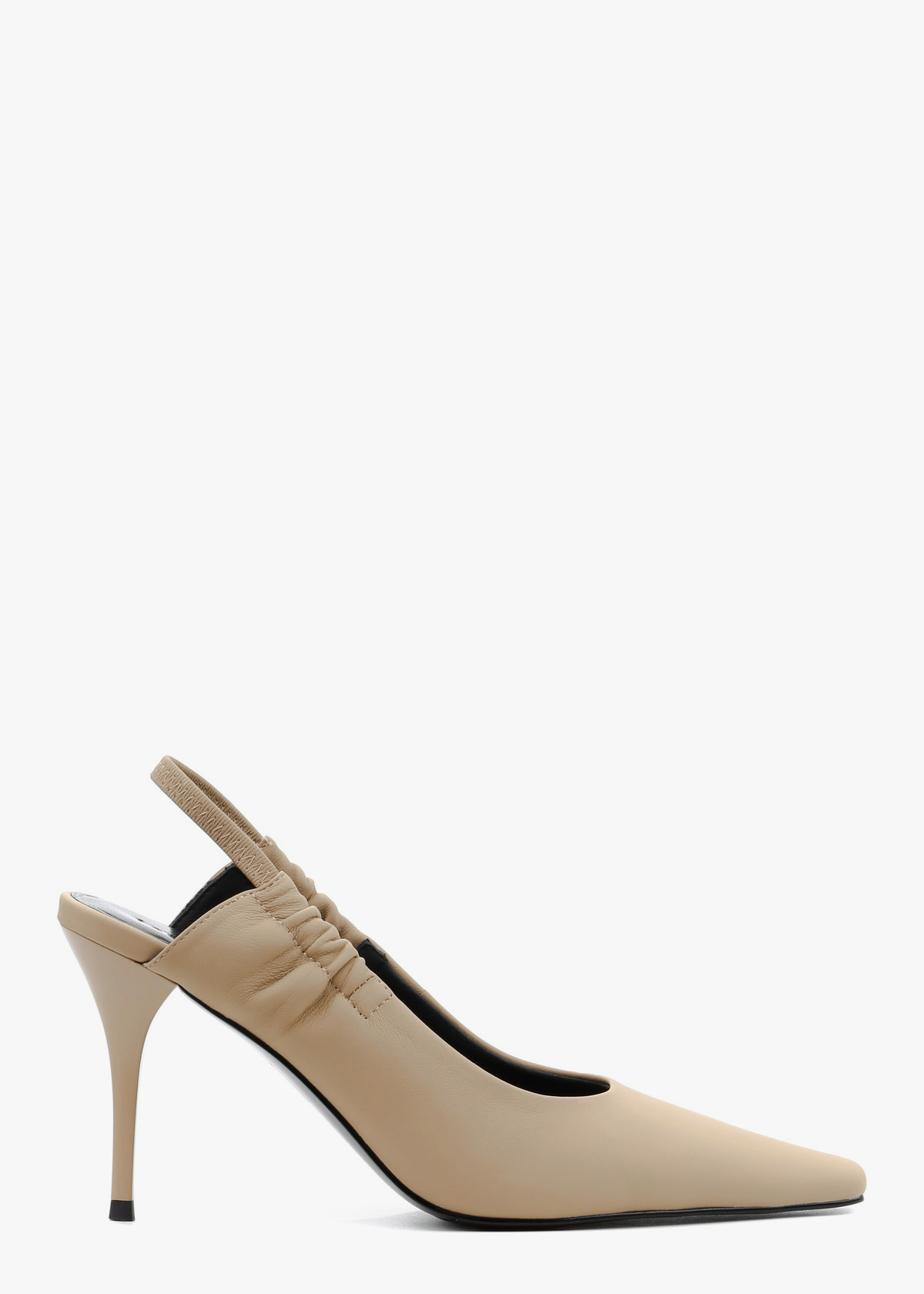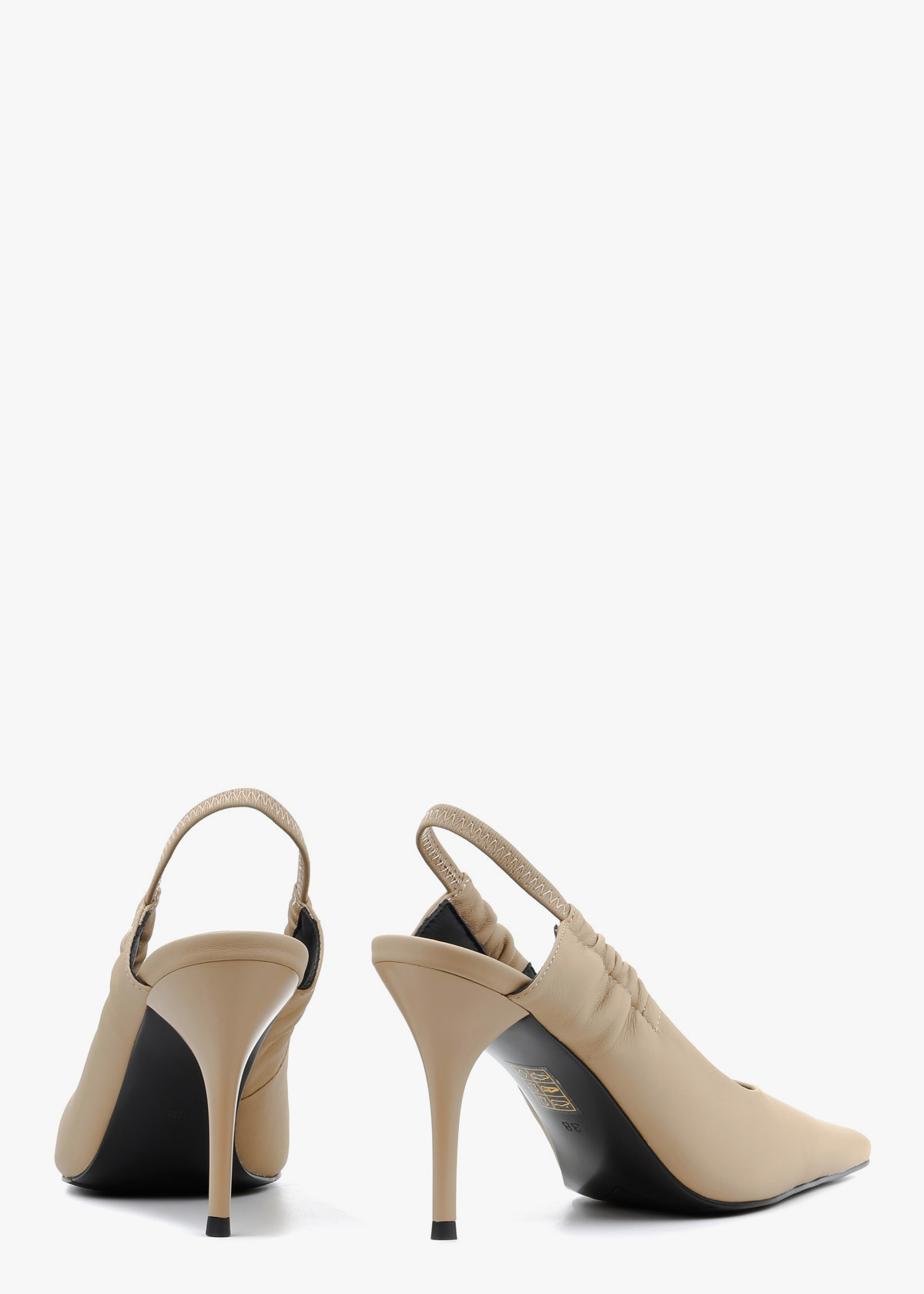 Жіночі сабо виконані з гладкої натуральної шкіри класичного бежевого кольору. Модель має витончений загострений мис та еластичний ремінець на заднику, що забезпечує комфортну посадку без зайвих застібок. Високий підбор-шпилька додає силуету жіночності, роблячи ці туфлі універсальним доповненням як до ділового костюма, так і до вечірньої сукні.