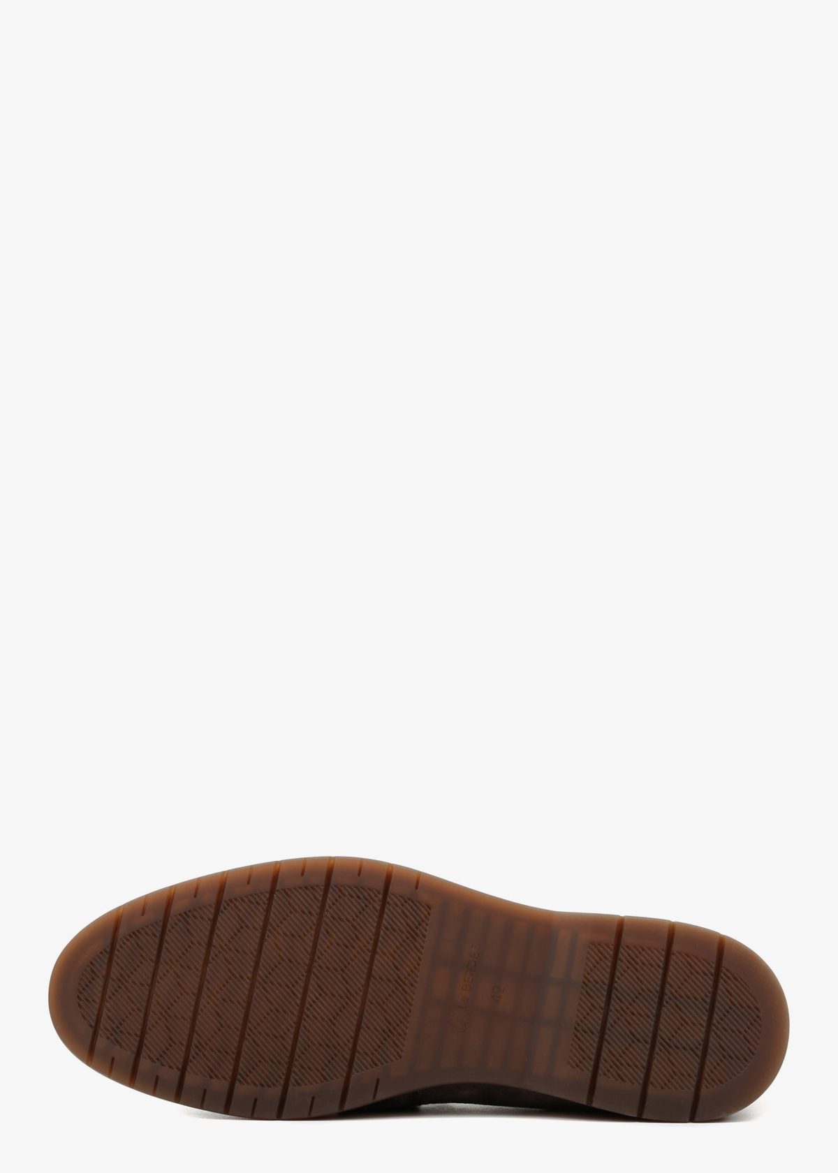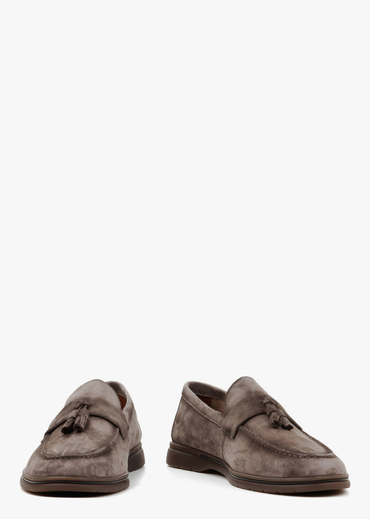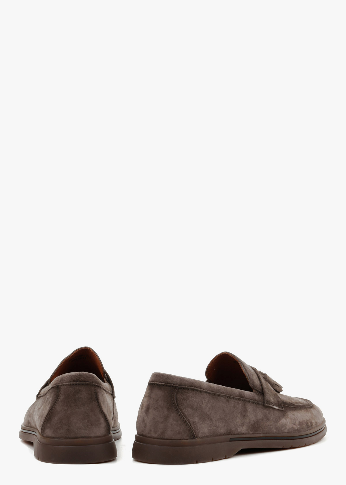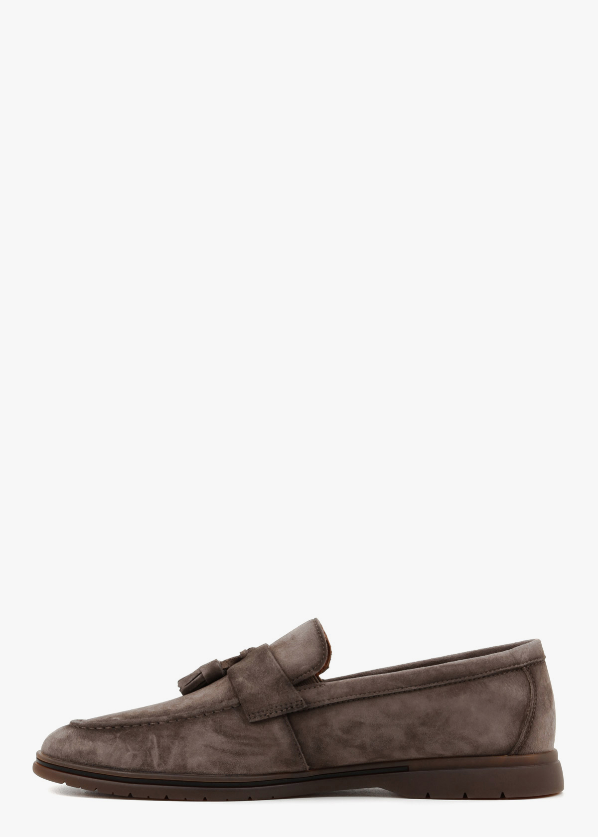 Класичні чоловічі лофери виготовлені з високоякісної натуральної замші благородного кавового кольору з характерною ворсистою фактурою. Модель доповнена традиційними декоративними китицями та акуратним швом на мисі, що підкреслює стриманий силует взуття. Гнучка підошва коричневого кольору з невеликим підбором забезпечує амортизацію та комфортне положення стопи протягом усього дня. Лаконічний дизайн і спокійний відтінок роблять цю пару практичним рішенням для ділового гардероба.