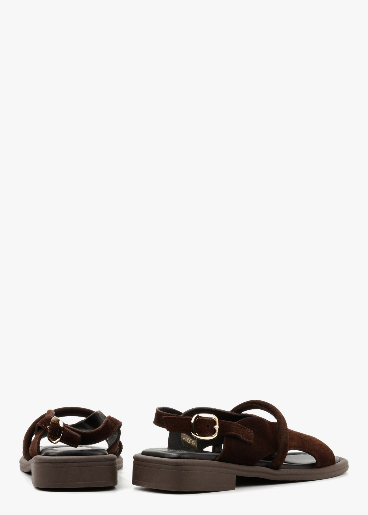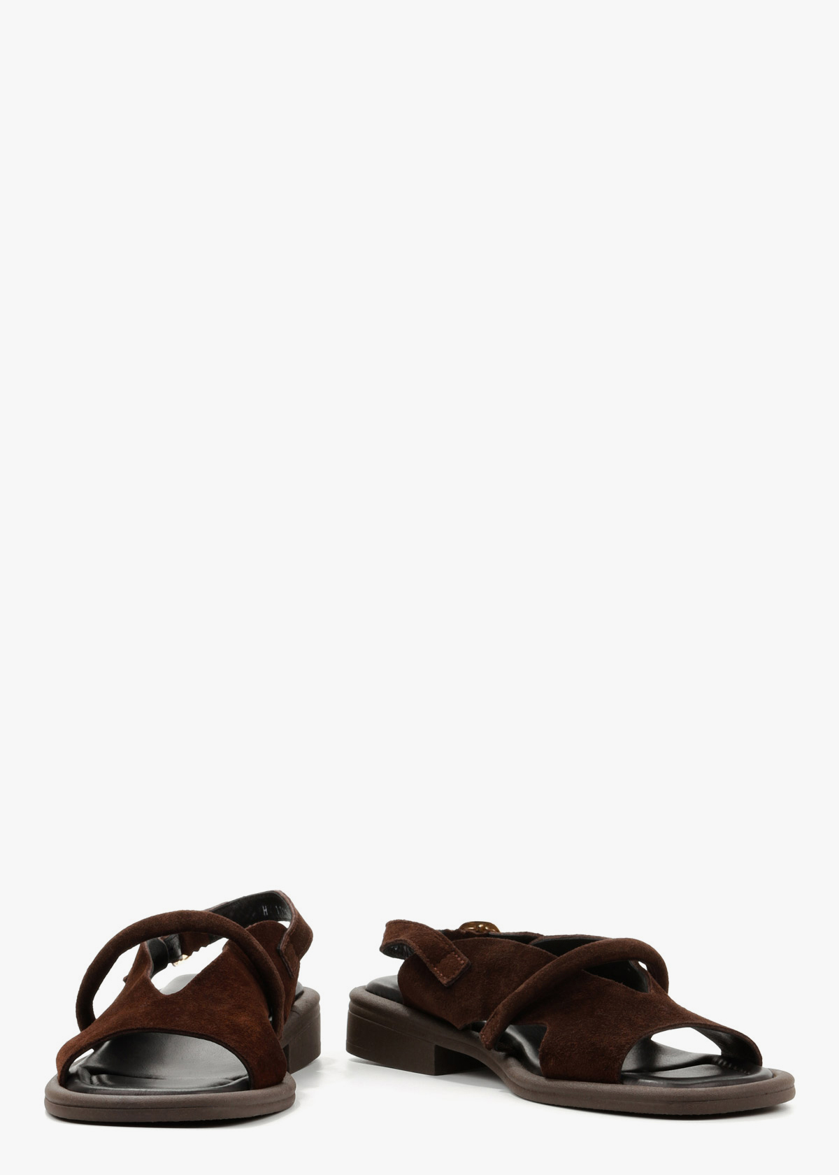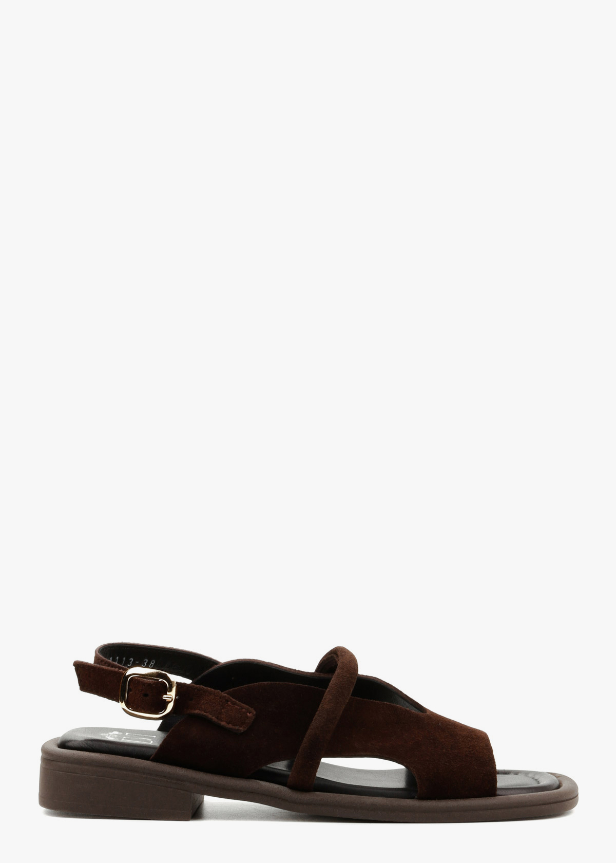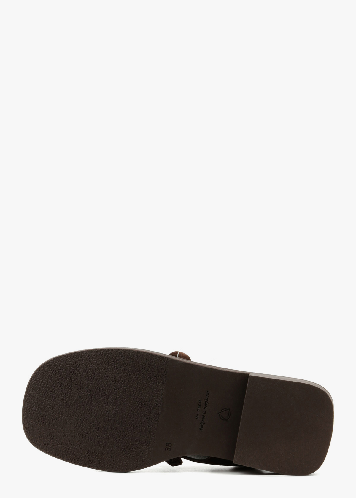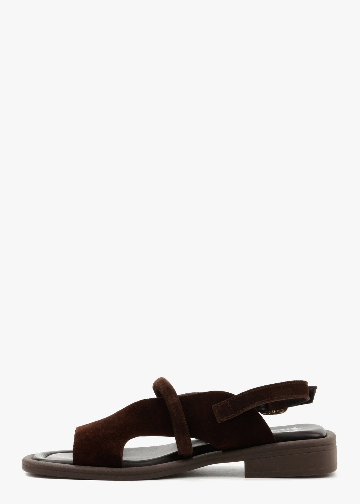 Мінімалістичні сандалії з відкритим мисом виготовлені з високоякісної натуральної шкіри шоколадного кольору. Конструкція верху поєднує широку деталь та тонкий трубчастий ремінець, що забезпечує надійну підтримку стопи та сучасний вигляд. П’ятковий ремінець оснащений невеликою круглою пряжкою золотистого кольору для зручного регулювання об’єму. Стійка пласка підошва з невеликим підбором гарантує легкість у кожному кроці, роблячи пару бездоганним вибором для щоденних образів.
