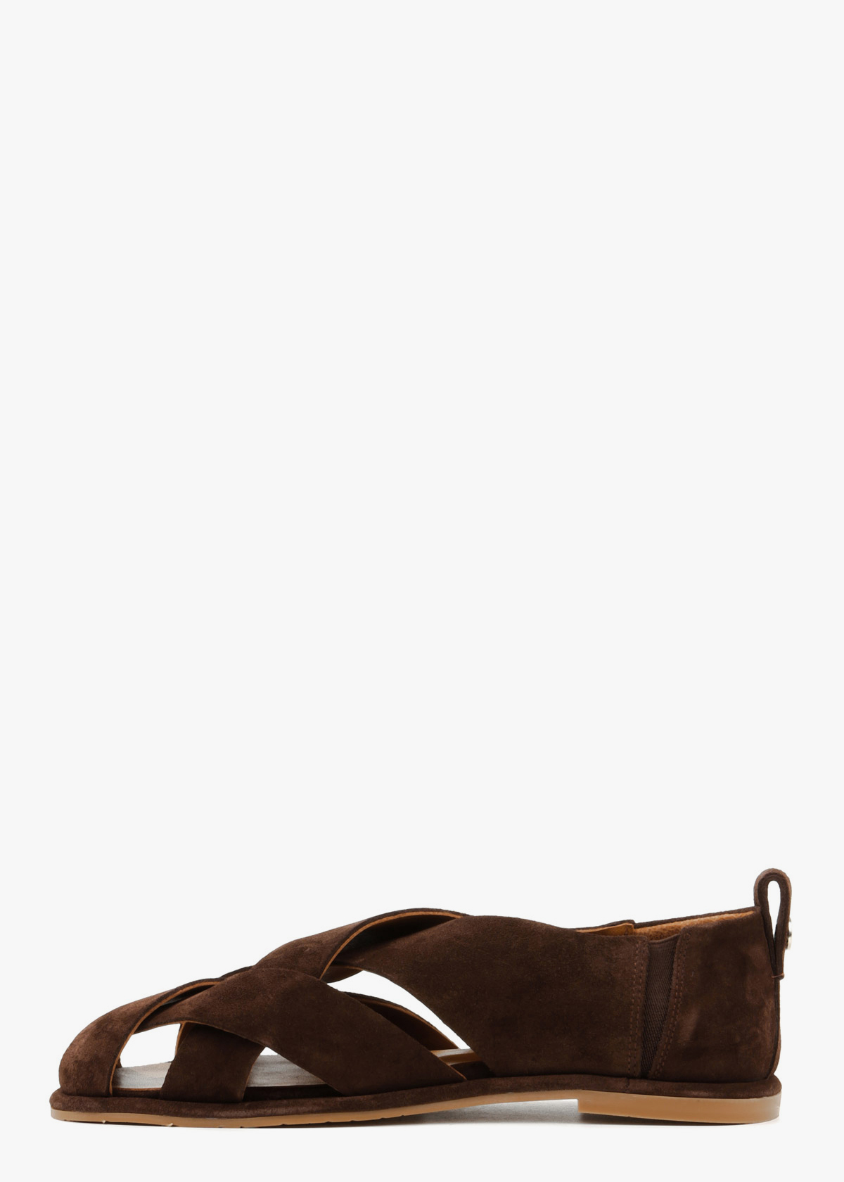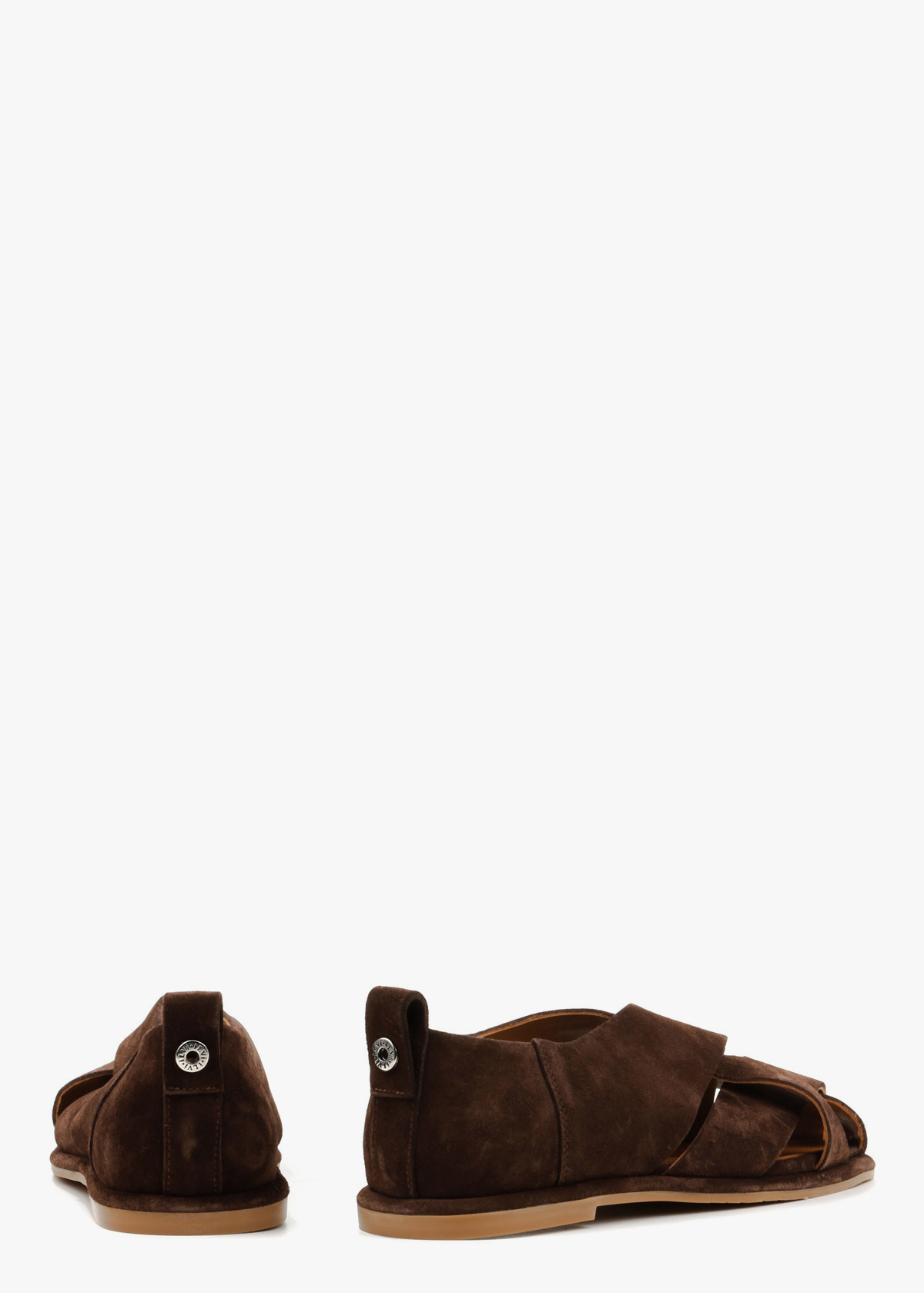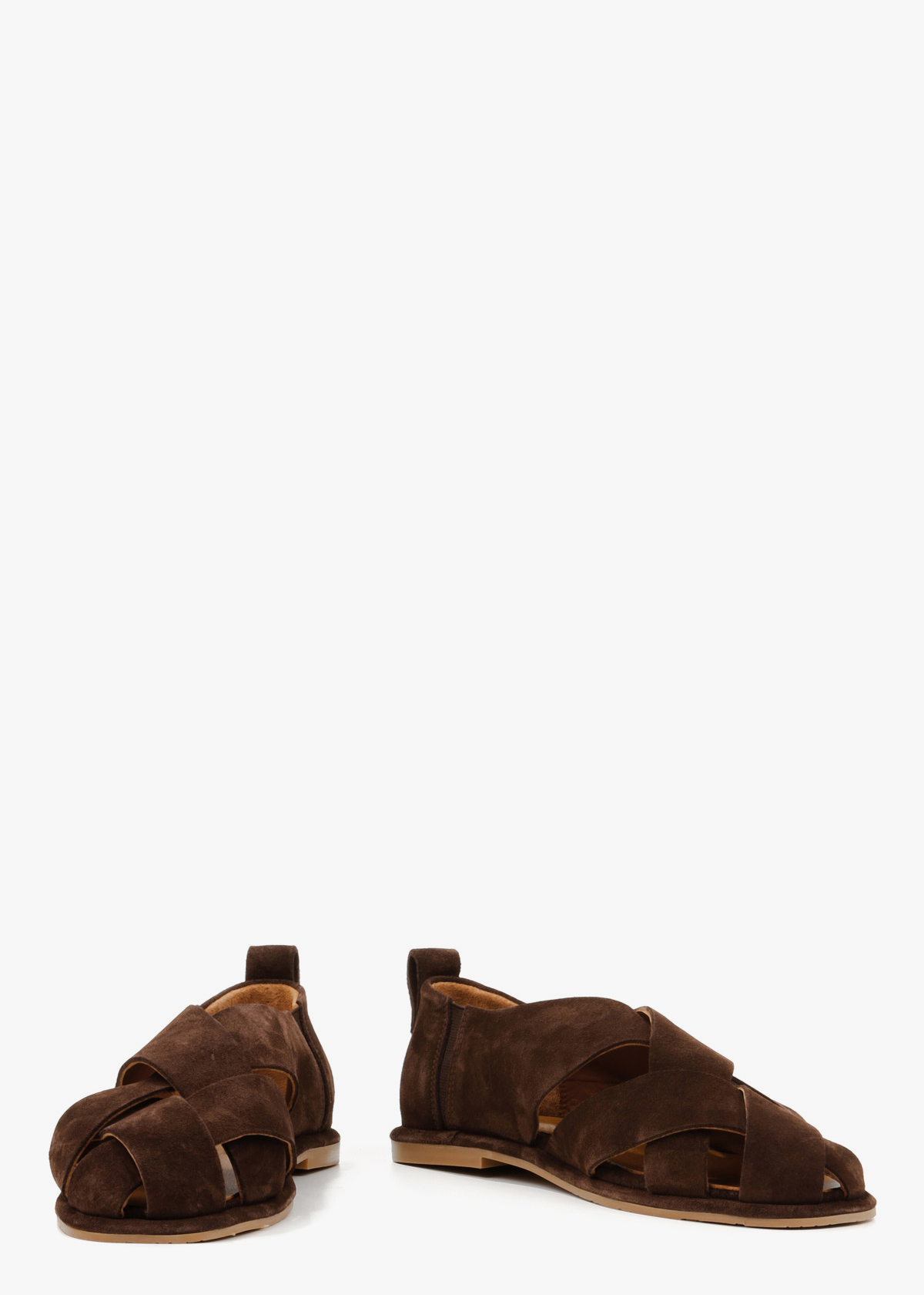 Замшеві сандалі насиченого темно-коричневого кольору вирізняються оригінальним дизайном із широких переплетених ременів. Модель має закриту п'яту з петлею для зручного взування та відкриті бокові частини, що забезпечує відмінну вентиляцію в літній період. М'яка фактура натуральної замші надає парі затишного та дорогого вигляду, а гнучка тонка підошва бежевого кольору гарантує комфорт при ходьбі. Завдяки лаконічному силуету та стриманій палітрі, це взуття стане універсальною базою для повсякденних образів. Поєднання закритого мису та переплетених елементів створює стильний баланс між сандалями та легкими туфлями.