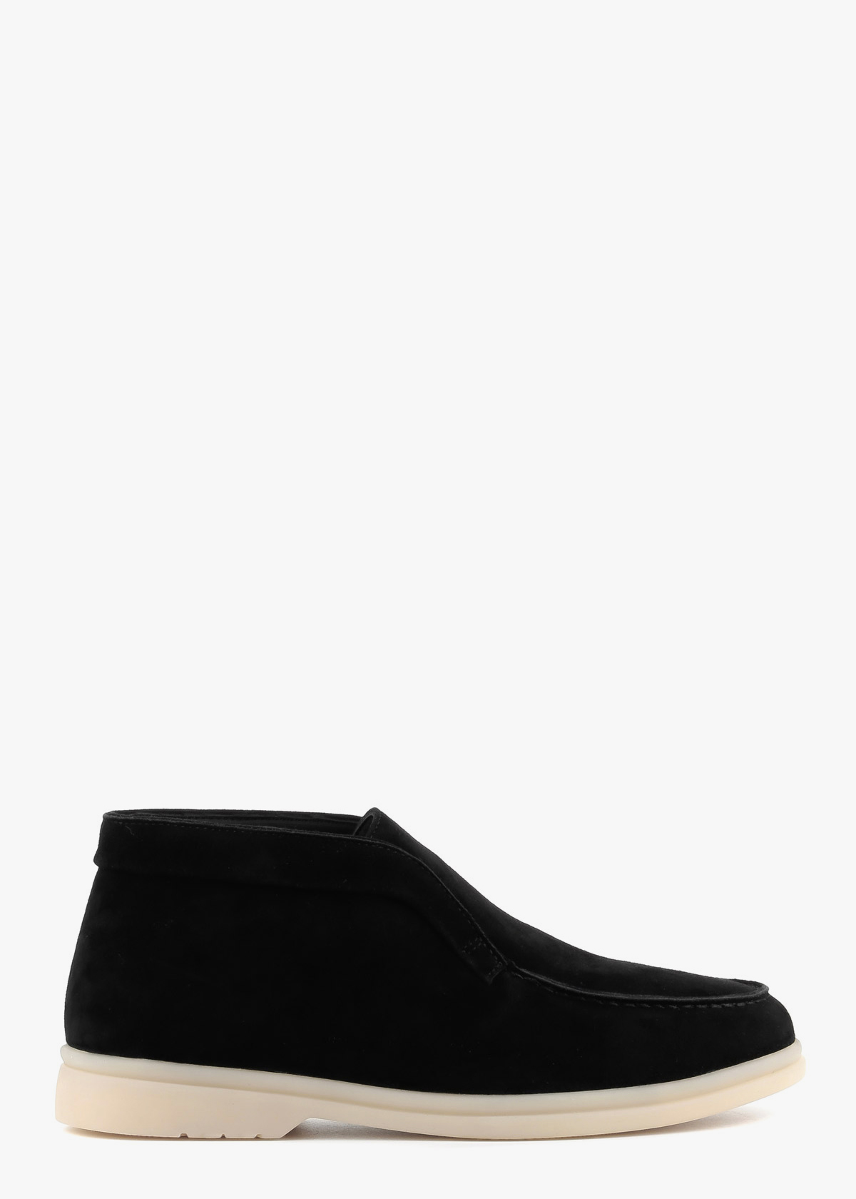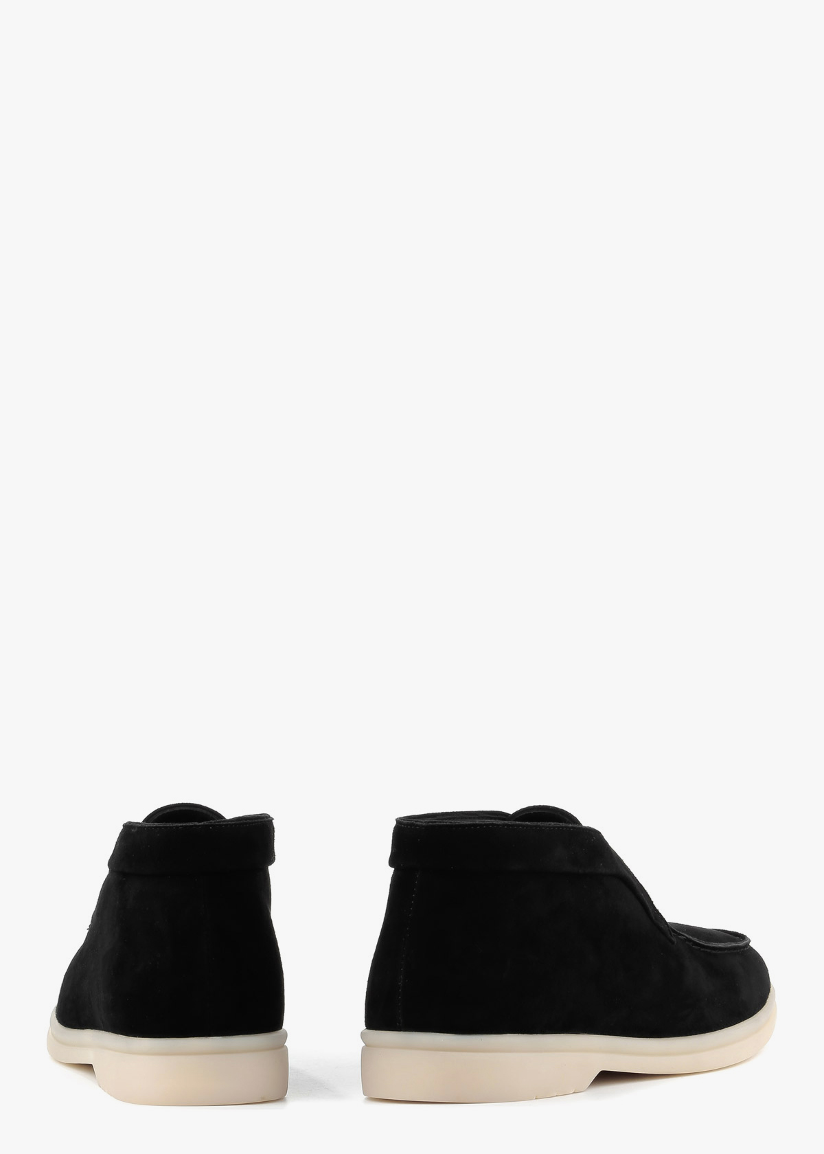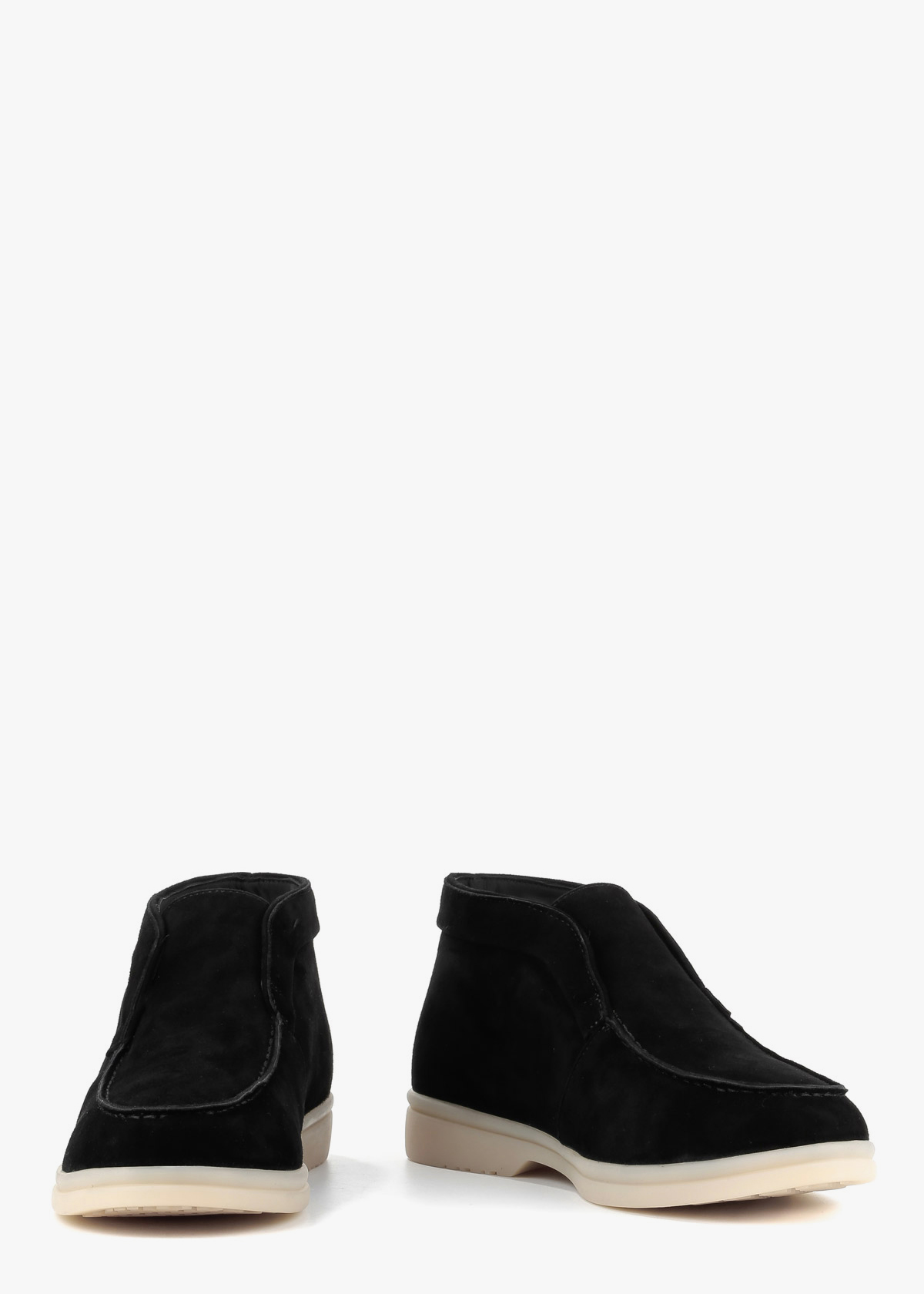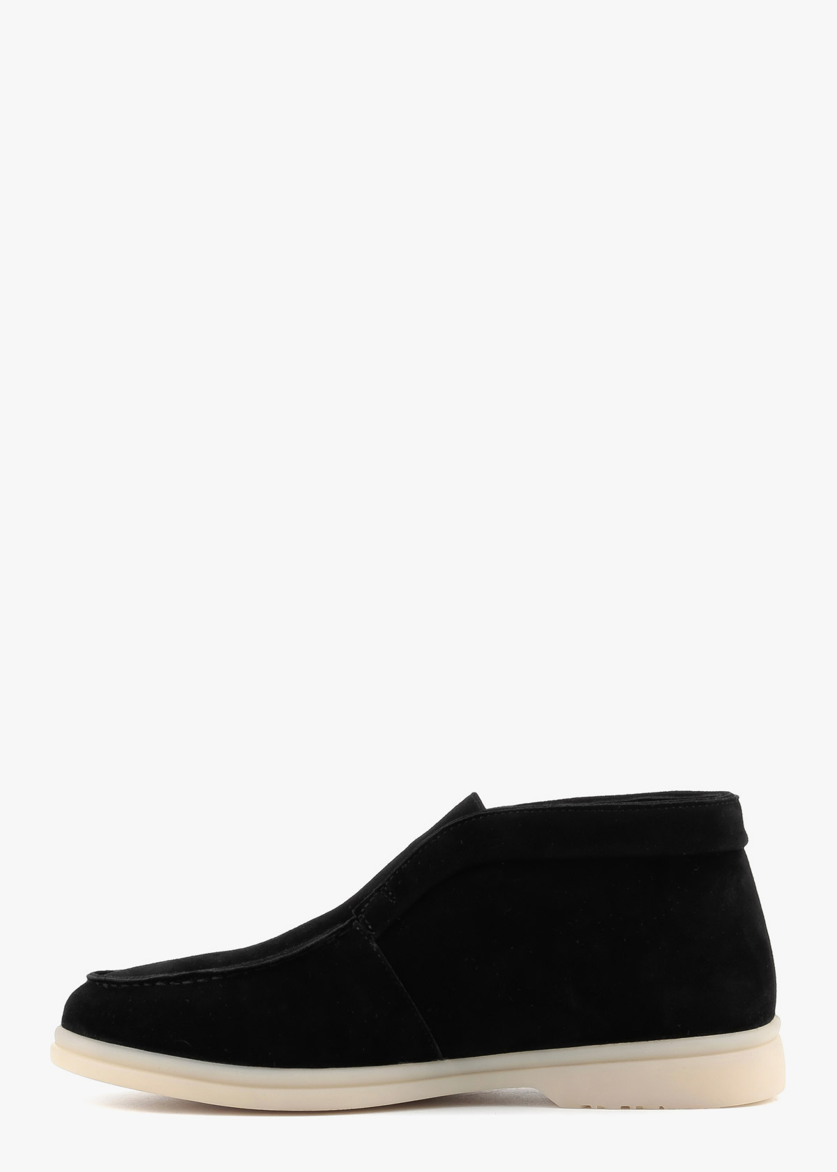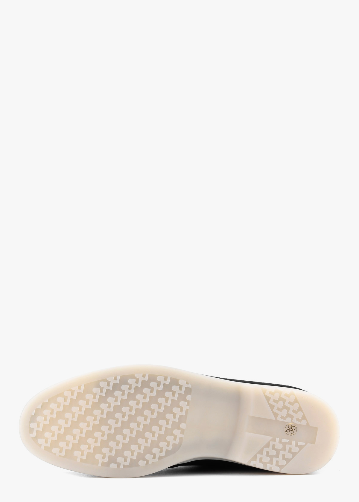 Эти замшевые лоферы — удачное сочетание сдержанной элегантности и современного комфорта. Мягкая чёрная замша придаёт обуви глубину и тактильную роскошь, а контрастная светлая подошва освежает силуэт и добавляет ему современное звучание. Благодаря отсутствию шнуровки и лаконичному дизайну, лоферы легко вписываются как в деловой гардероб, так и в расслабленные повседневные образы. Это обувь для тех, кто ценит стиль без излишеств и ставит комфорт на первое место.