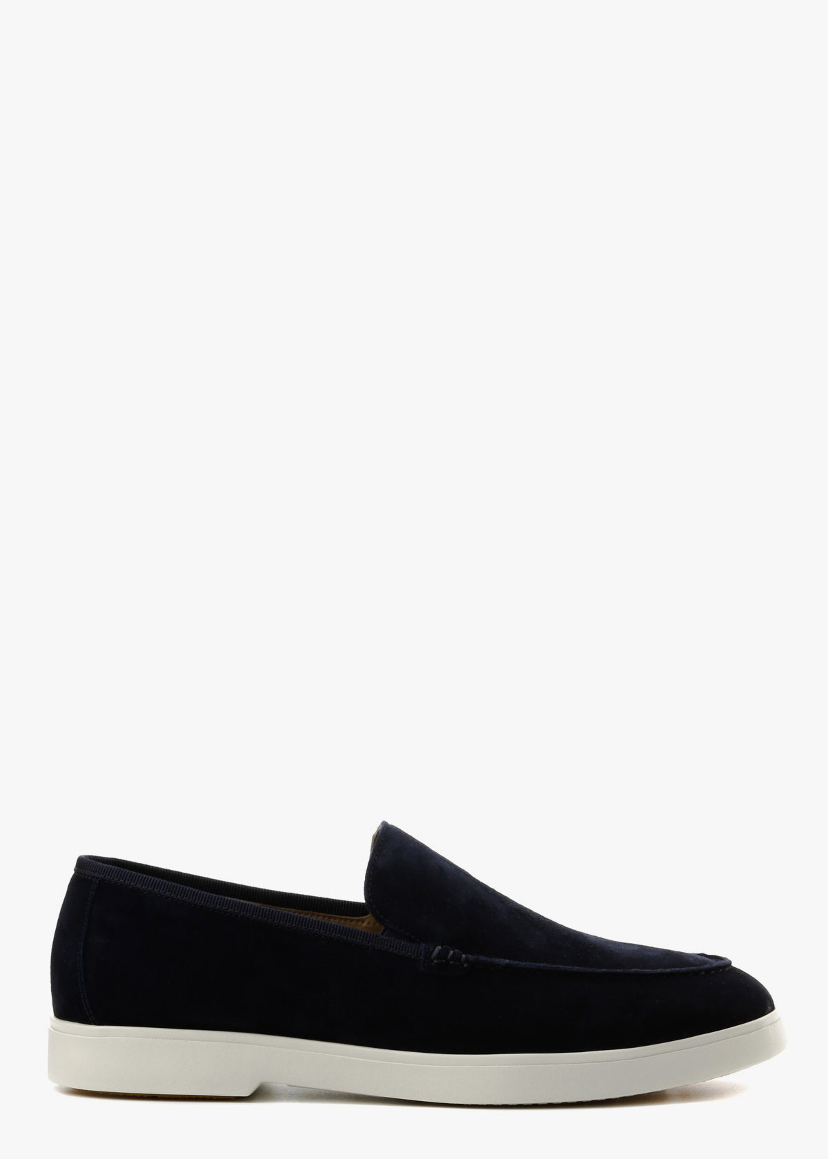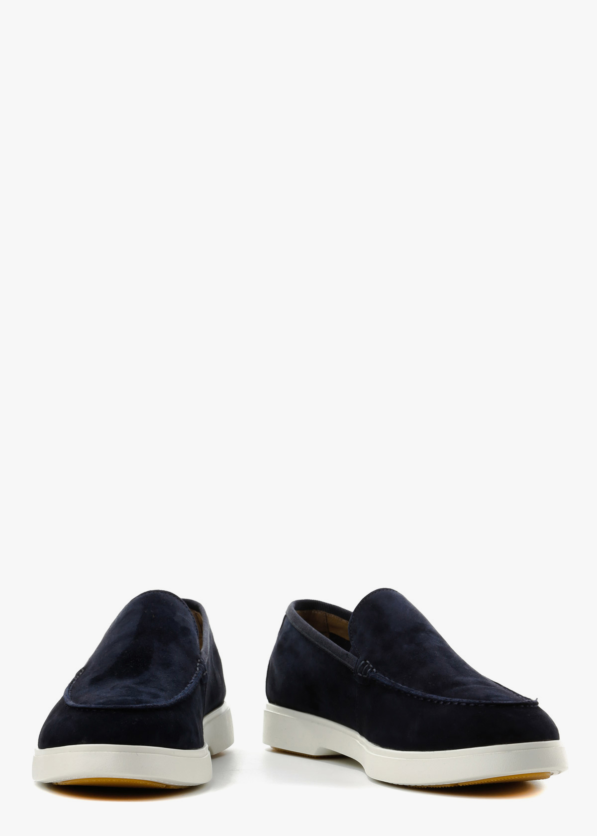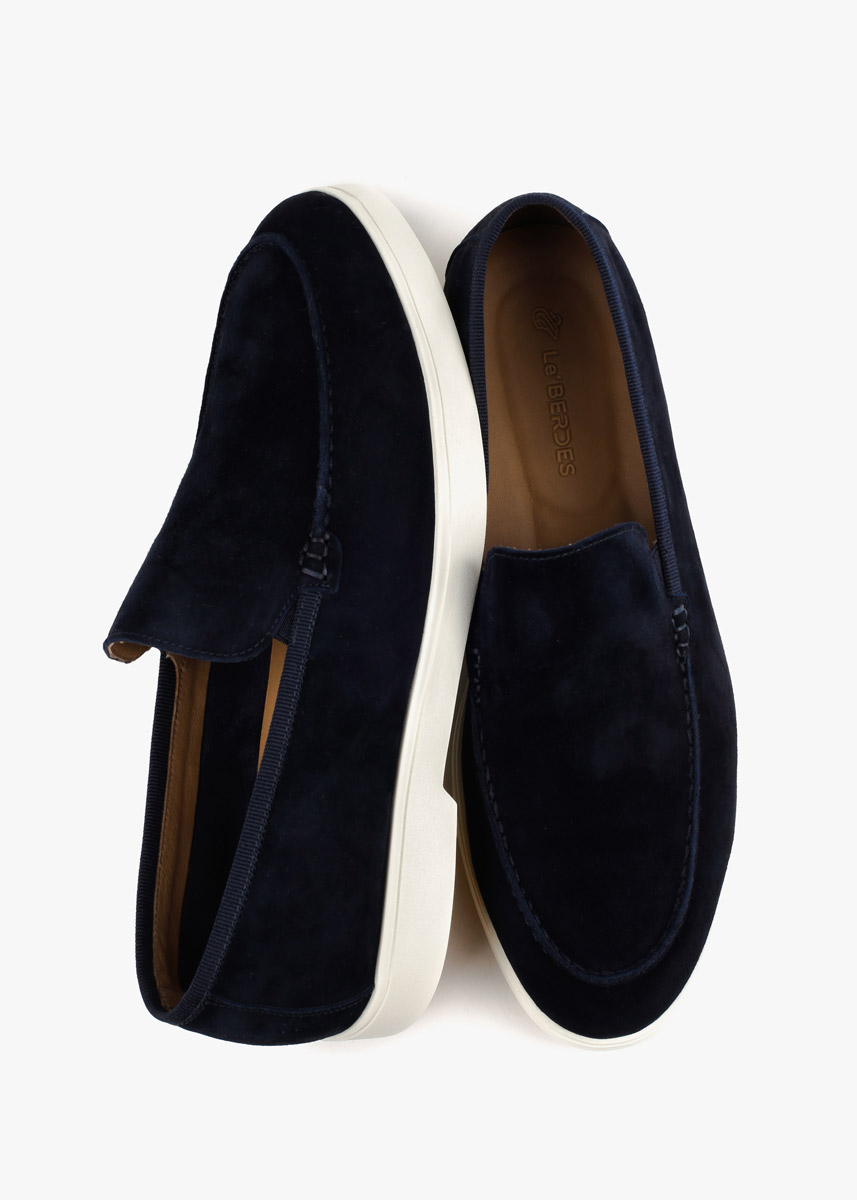 Мужские лоферы в темно-синем цвете, сделаны из натуральной мягкой замши. Модель отличается лаконичным дизайном с характерным швом на мысе и тонкой текстильной окантовкой по линии стопы. Контрастная белая подошва придает обуви современный вид, делая ее идеальным вариантом для ваших образов.