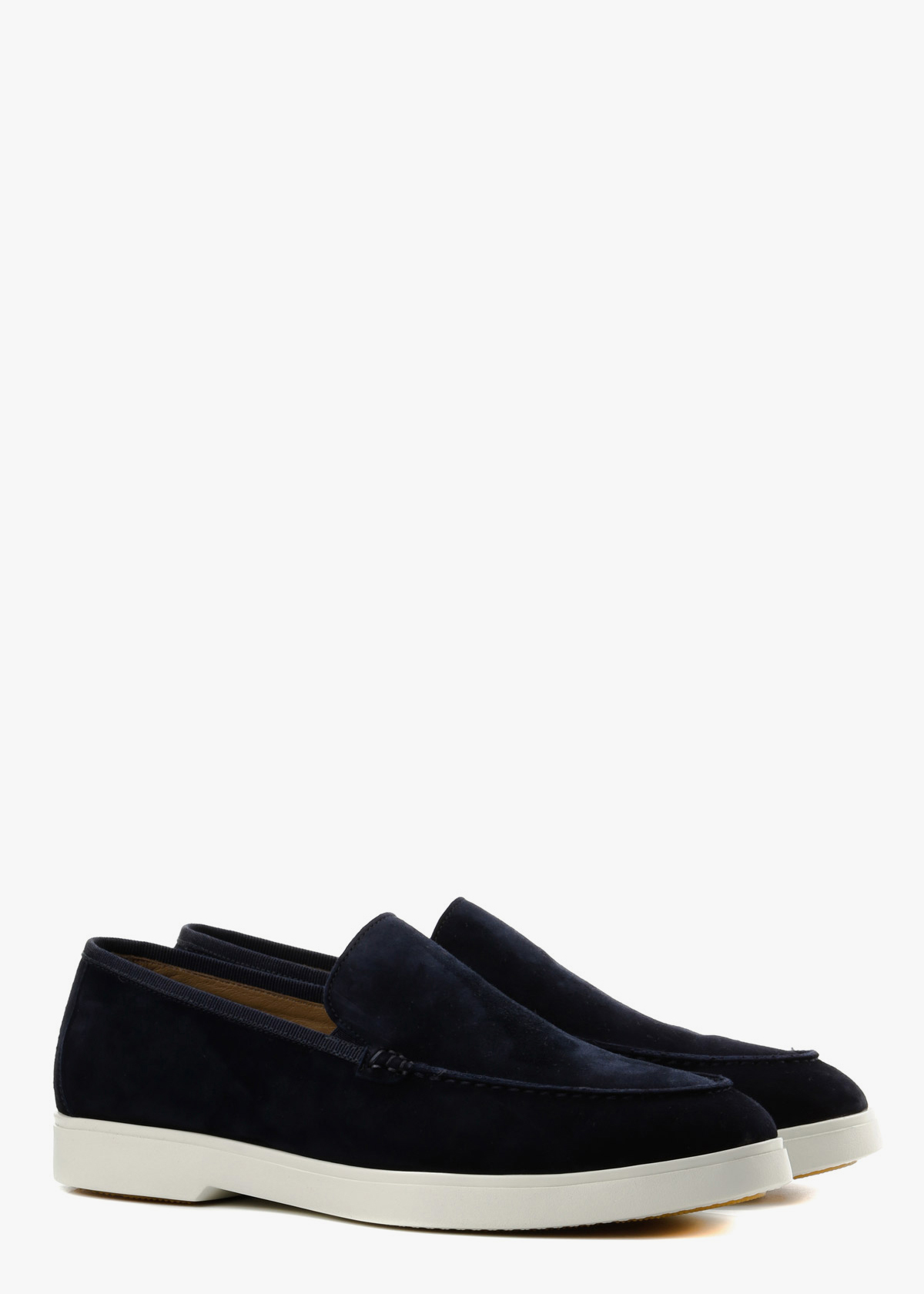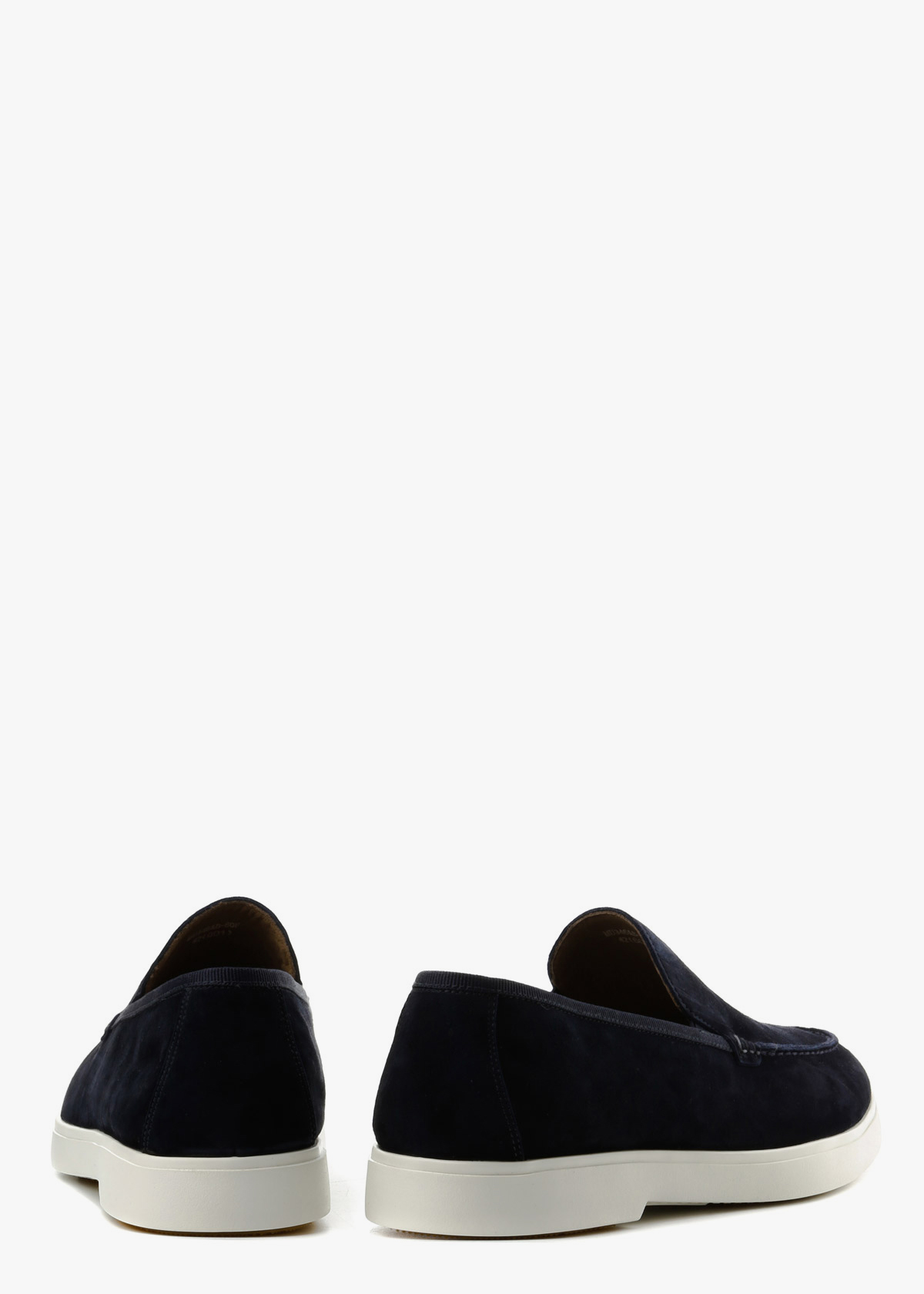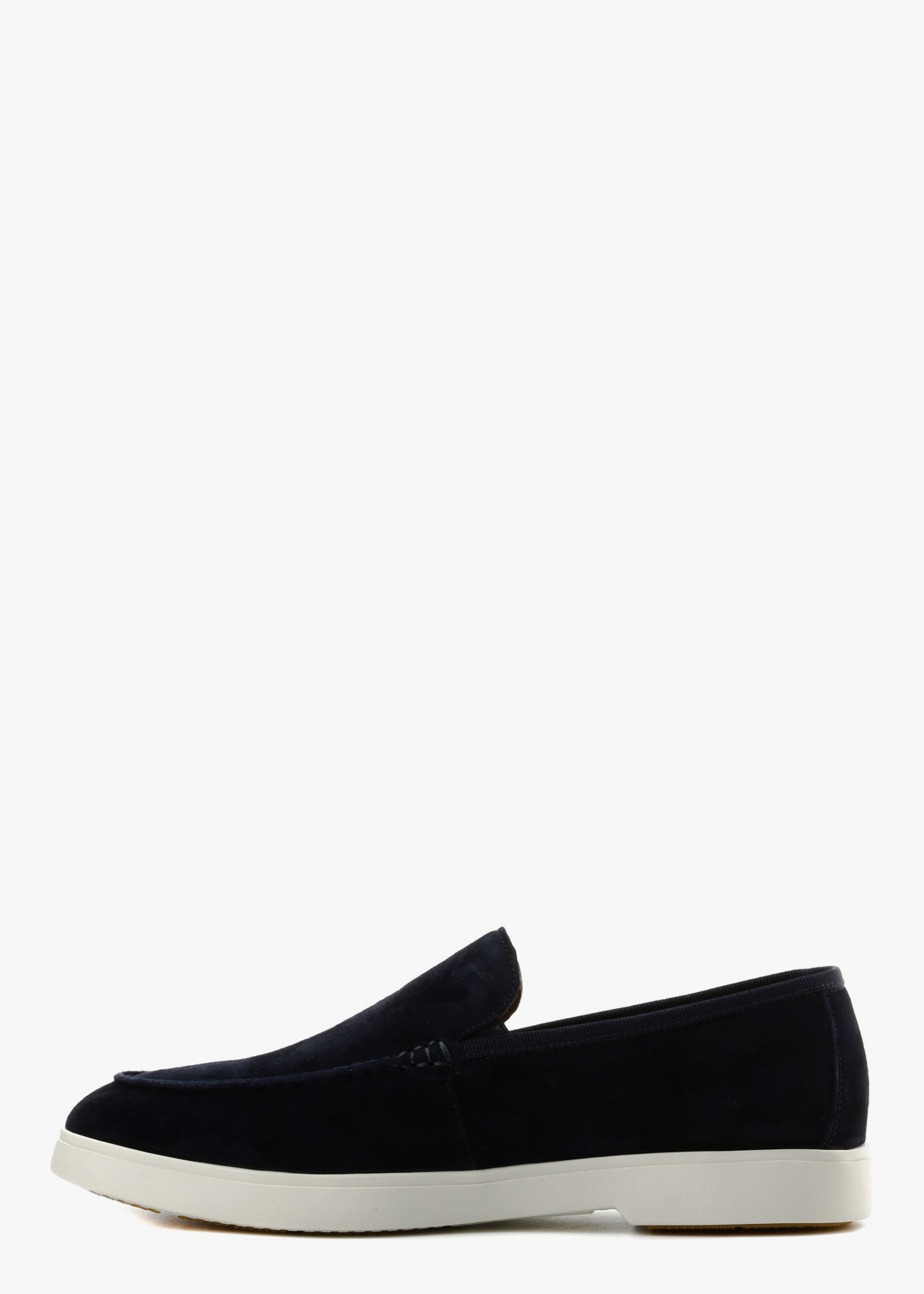 Мужские лоферы в темно-синем цвете, сделаны из натуральной мягкой замши. Модель отличается лаконичным дизайном с характерным швом на мысе и тонкой текстильной окантовкой по линии стопы. Контрастная белая подошва придает обуви современный вид, делая ее идеальным вариантом для ваших образов.